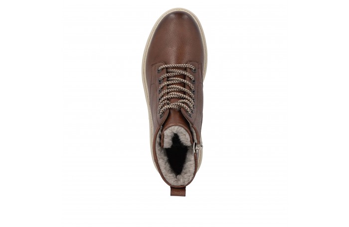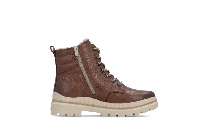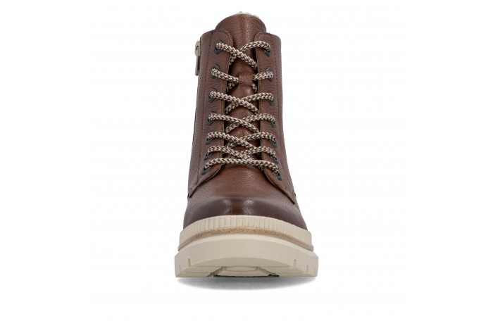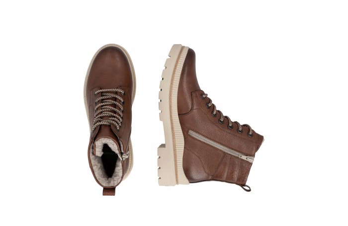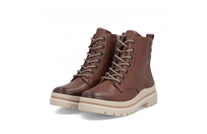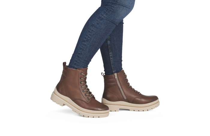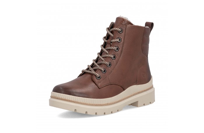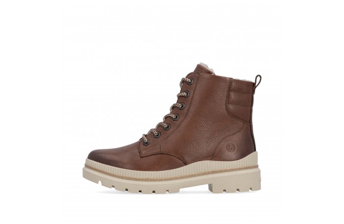 Remonten ruskea talvinilkkuri. Pinta nahkaa. Lämmin, paksu villavuori ja irrotettava Thermo pohjallinen. Sisäsyrjällä vetoketju ja edessä nauhat. Paksu, pitävä Grip-ulkopohja.