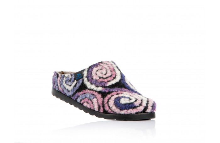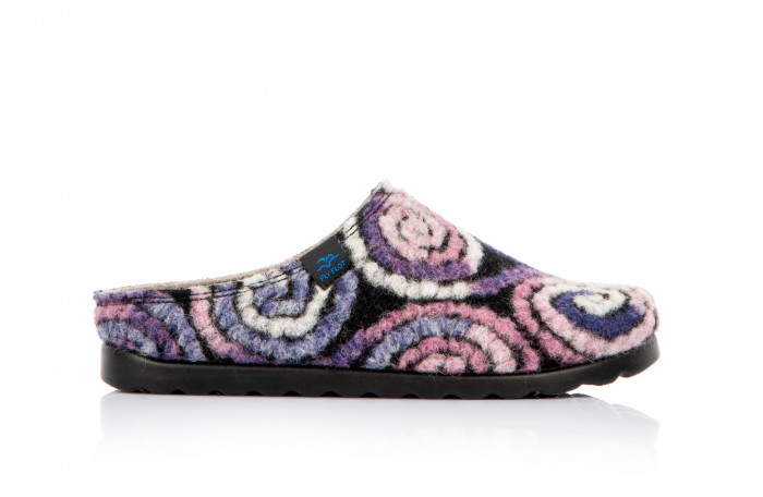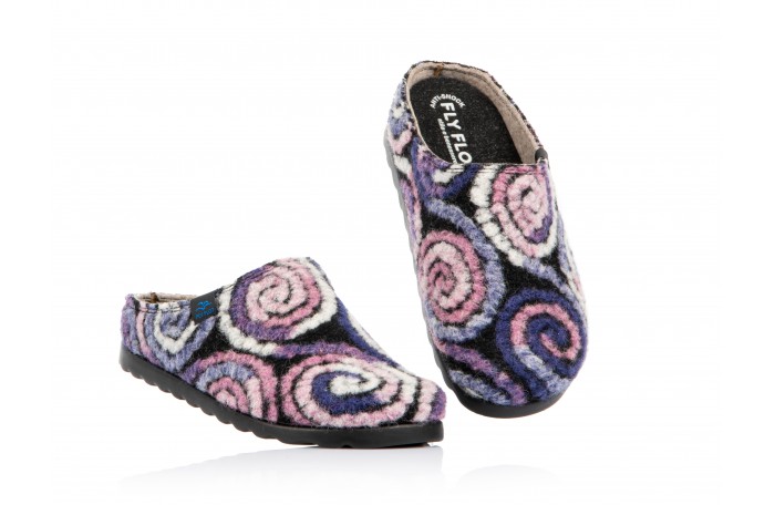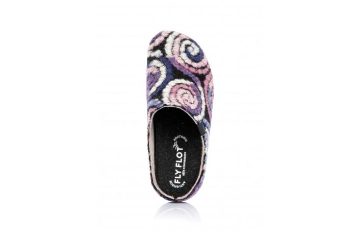 Italialainen Fly Flotin pistokas / kotikenkä. Multivärinen spiraalikuviointi. Pinta huopaa, josta 80% villaa. Sisäpohja huopaa. Laaja malli ja melko rintava malli. Jalkineissa on iskunvaimennus, anatomisesti muotoiltu pohjallinen, joka muotoutuu vielä oman jalan mukaan, sekä pitävä ulkopohja.