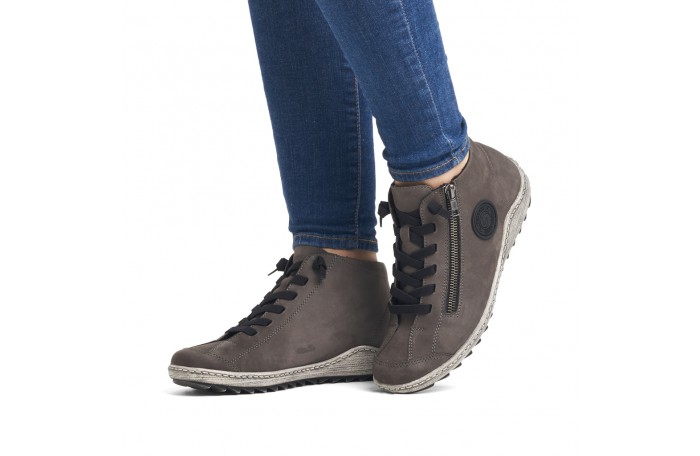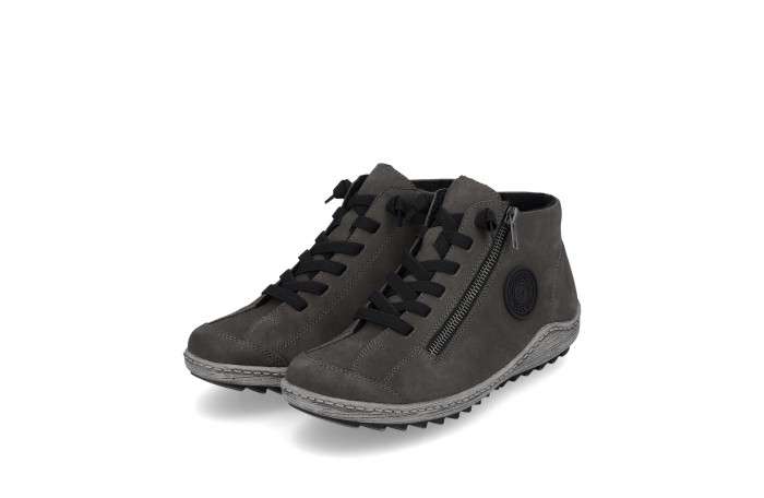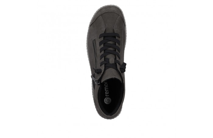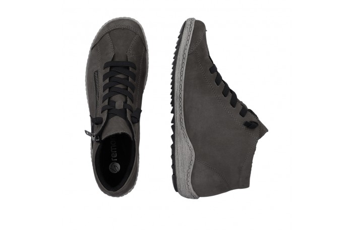 Remonten harmaa syystennari. Pinta pehmeää "mokkamaista" nahkaa. Ohut lämpövuori. Irrotettava, pehmeä Soft pohjallinen. Ulkosyrjällä avattava vetoketju ja edessä nauhoitus. Kannan korkeus n. 2,5 cm.