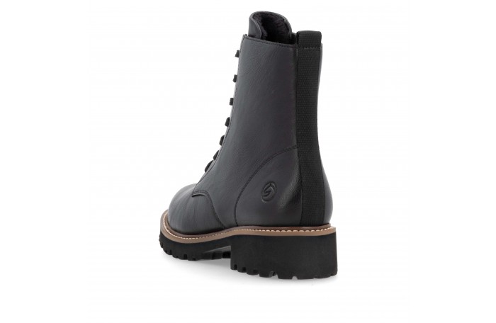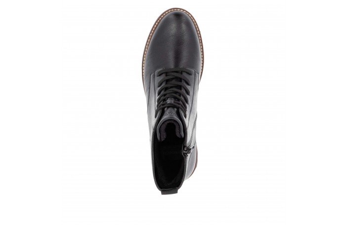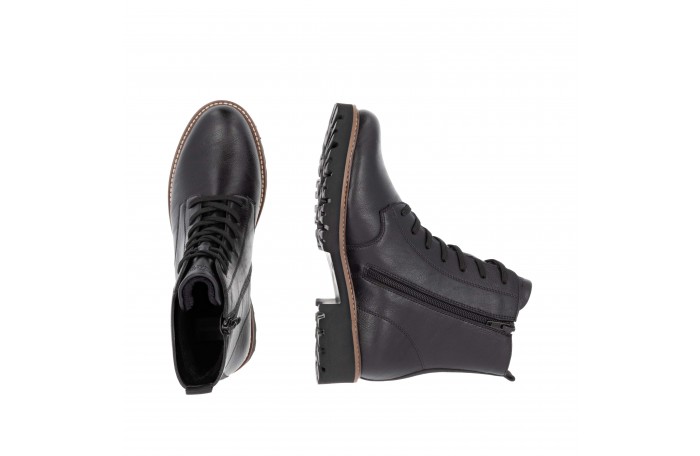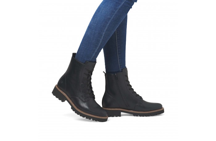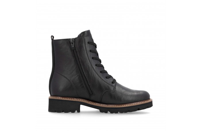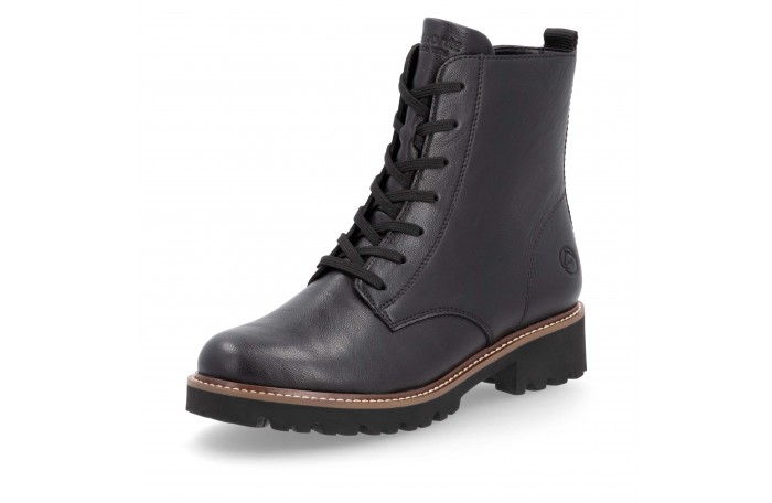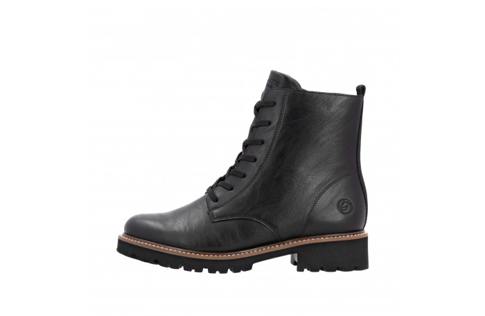 Remonten musta nilkkuri. Pinta nahkaa. Ohut lämmin sisävuori ja huopapohjallinen. Sisäsyrjällä vetoketju ja edessä nauhat. Kannan korkeus n. 4 cm.