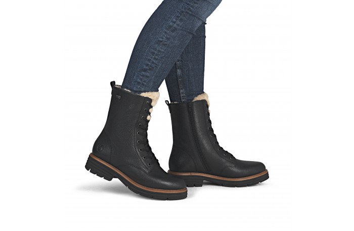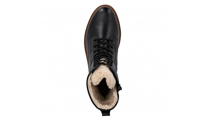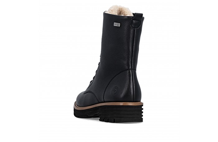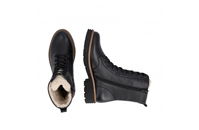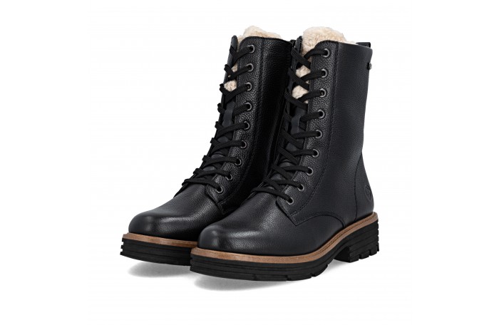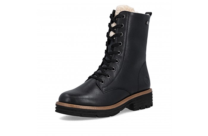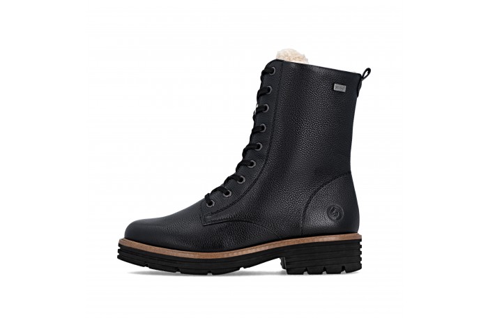 Remonten musta talvinilkkuri. Pinta nahkaa. Lämmin, paksu villavuori ja irrotettava villa pohjallinen. Jalkineessa on kosteutta hylkivä Tex-kalvo. Sisäsyrjällä vetoketju ja edessä nauhat. Iltin yläosassa turkis somiste. Kannan korkeus n. 4 cm.