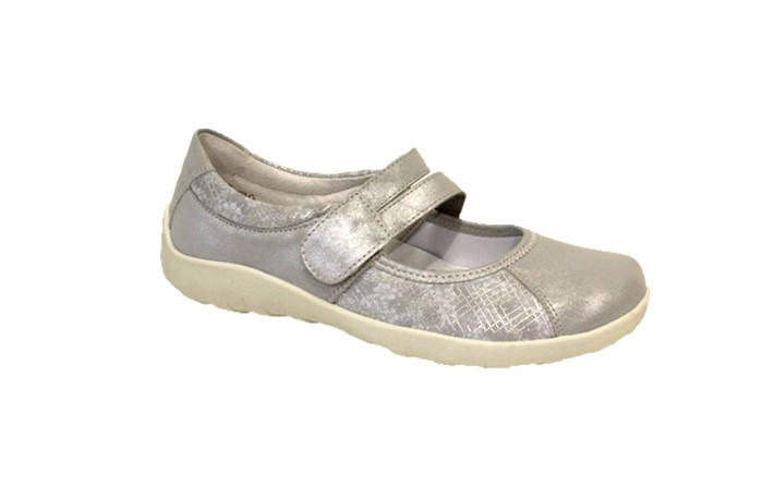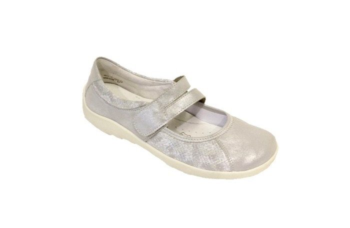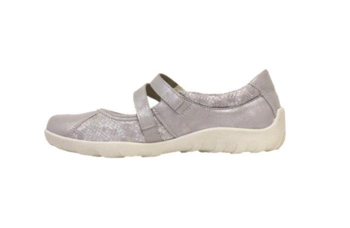 Remonten vaalean harmaat / hopeanhohtoiset balleriinat. Pinta keinoainetta ja sivuilla joustavaa tekstiiliä. Pehmeä sisävuori keinoainetta ja irrotettava Remonte soft sisäpohjallinen nahkaa. Edessä tarrallinen säätöremmi. Erittäin kevyt ja joustava jalkine kesään.