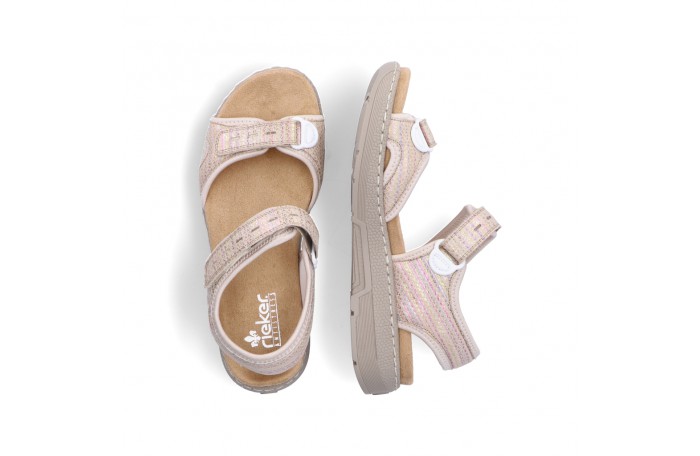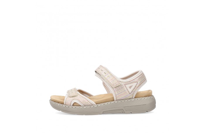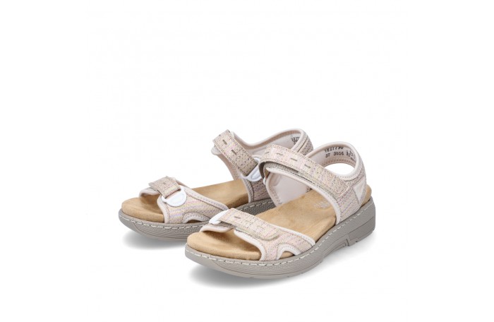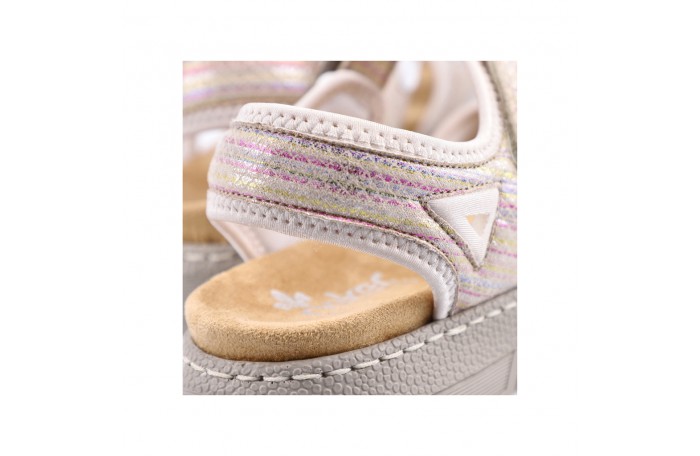 Riekerin multicolor sandaalit. Pinta keinoainetta. Pehmeä sisävuori tekstiiliä. Erittäin pehmeä ja joustava Antistress sisäpohja, keinoainetta. Kaksi tarrallista, säädettävää remmiä. Kannan korkeus n. 4 cm, etupohjan paksuus n. 2 cm