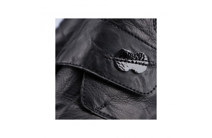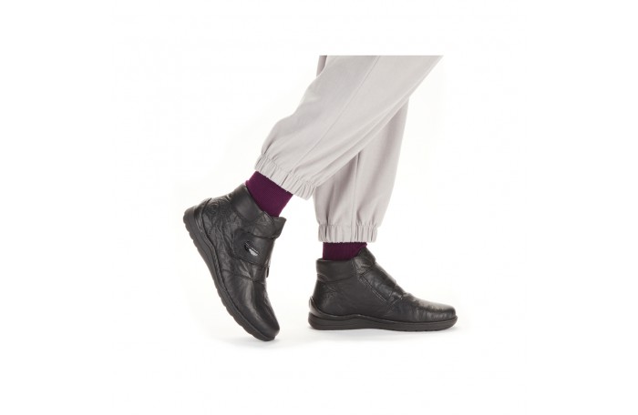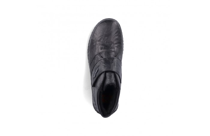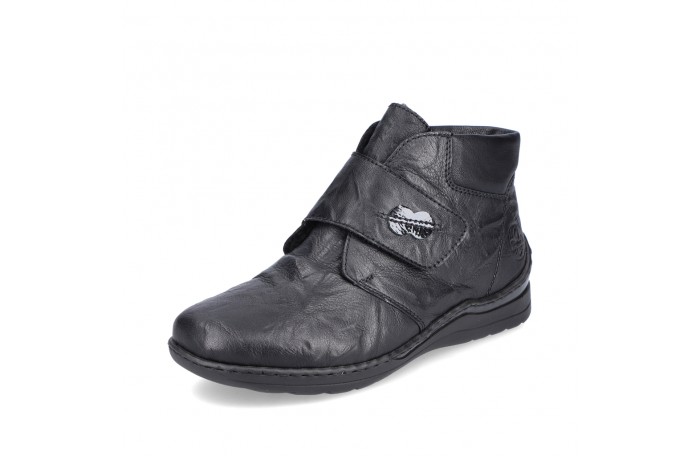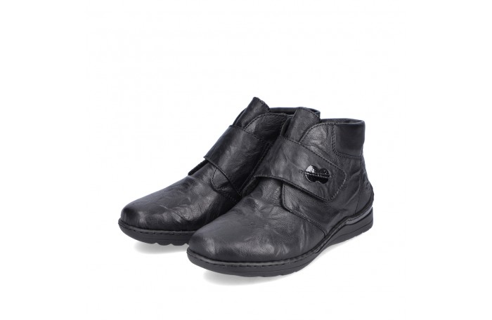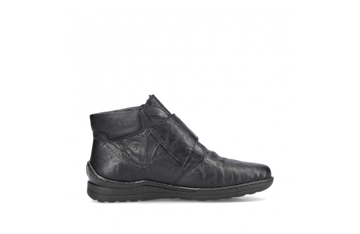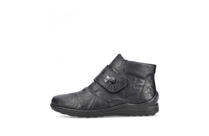 Riekerin musta, matalavartinen nilkkuri. Pinta nahkaa. Paksu turkisvuori ja huopapohjallinen. Pujotettava malli. Edessä paksu remmi tarrasäädöllä. Jalkineessa tilavampi H-lesti.  Kannan korkeus n. 2,5 cm.