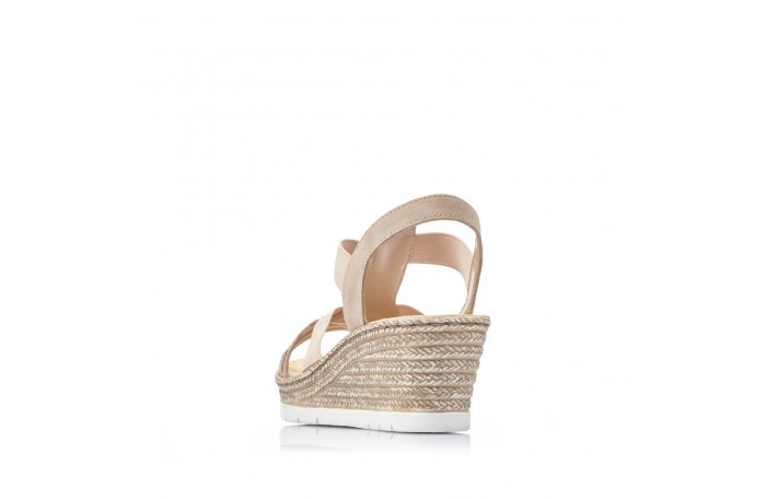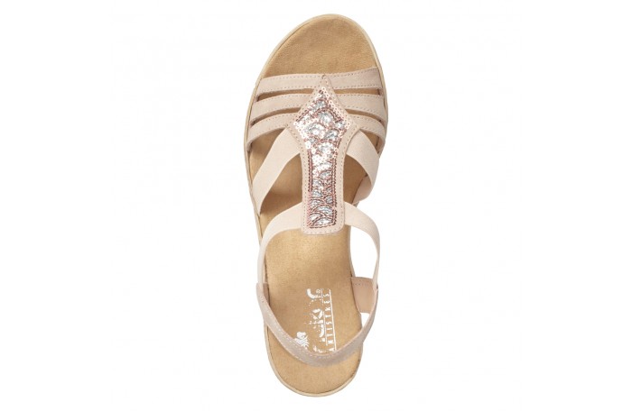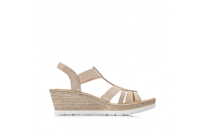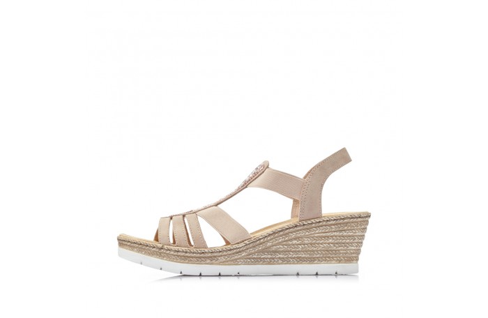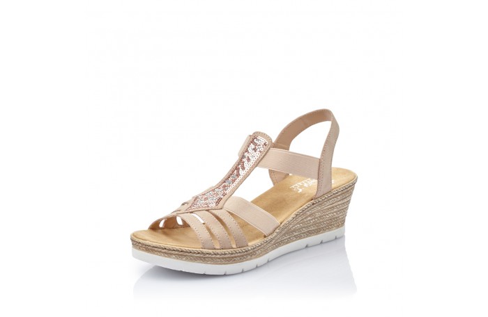 Riekerin vaalean roosa sandaali. Edessä roosan ja hopean värisiä paljetti somisteita. Pinta- ja sisävuori keinoainetta ja pehmeä AntiStress sisäpohja tekstiiliä. Pujotettava malli, jossa joustavat kuminauharemmit helpottavat pukemista. Kiilakorollinen malli. Kannan korkeus n. 6 cm, etupohjan paksuus n. 2 cm.