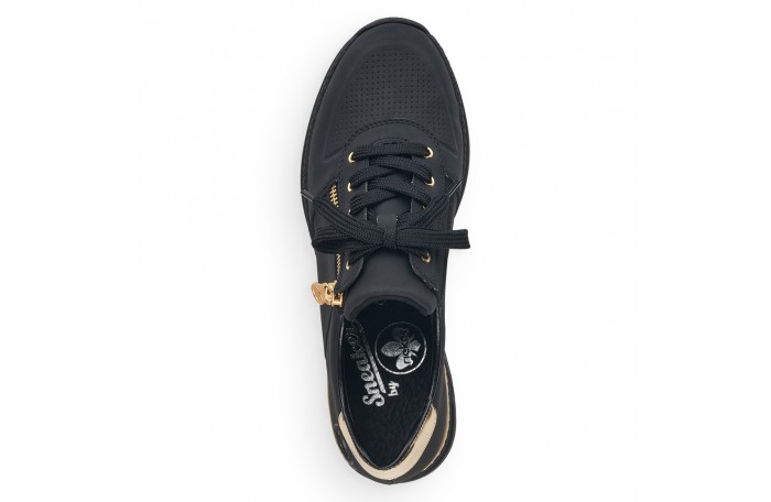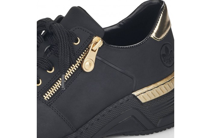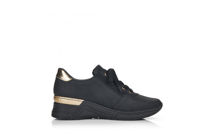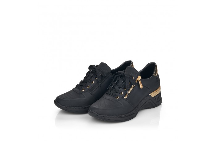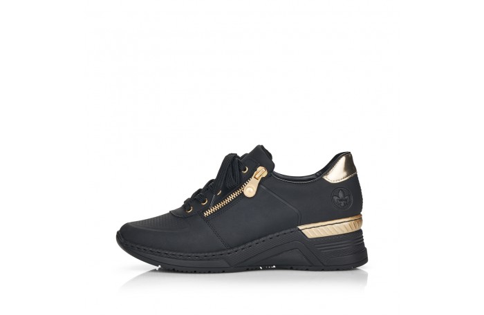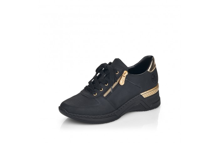 Riekerin musta kiilapohja tennari, jossa kultaiset yksityiskohdat. Pinta- ja sisävuori keinoainetta. Pehmeä Soft-sisäpohjallinen, nahkaa. Nauhakiinnitys ja ulkosyrjällä oleva vetoketju helpottavat pukemista. Kannan korkeus n. 5,5 cm. Etupohja 1,5 - 2 cm.