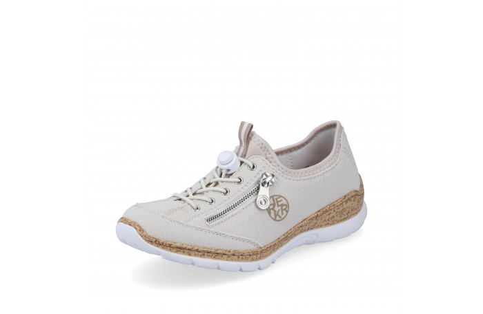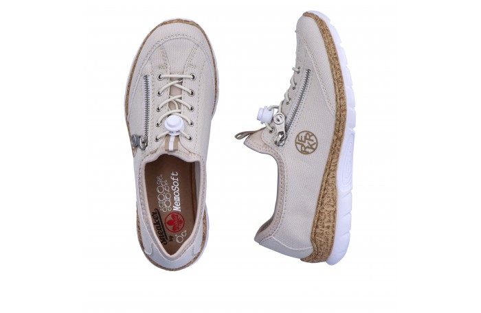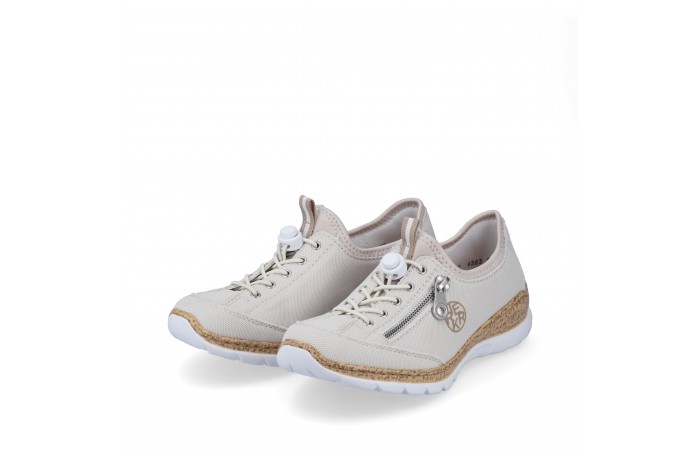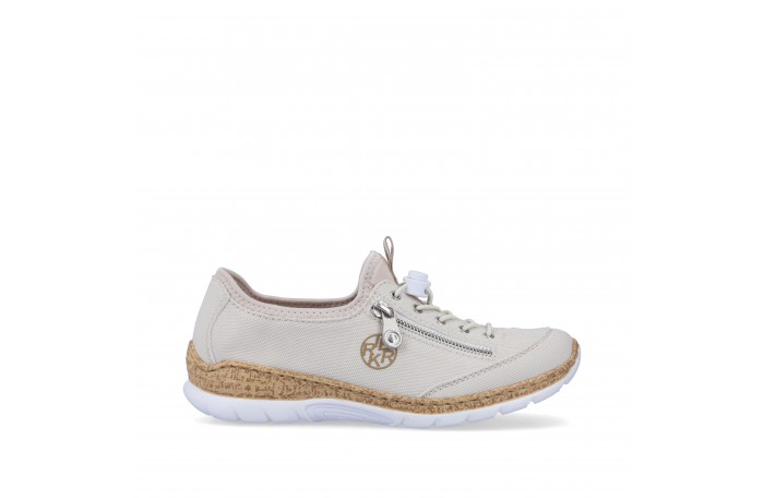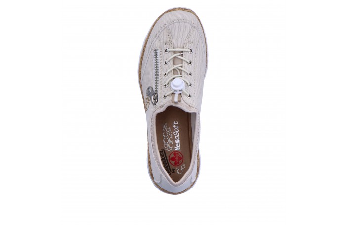 Riekerin vaalea tennari. Pinta tekstiiliä osin keinoainetta. Sisävuori pehmeää tekstiiliä. Jalkineessa on miellyttävä MemoSoft sisäpohja eli ns. muotovaahto pohja, joka muotoutuu käytössä jalan muotojen mukaisesti ja palautuu pois otettaessa. Pujotettava malli. Kengän ulkosyrjän somisteena vetoketju. Edessä olevalla nauhoituksella saa hieman säädettyä kireyttä . Kannan korkeus n. 3 cm.