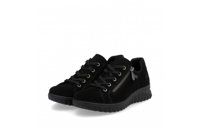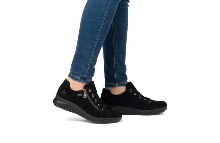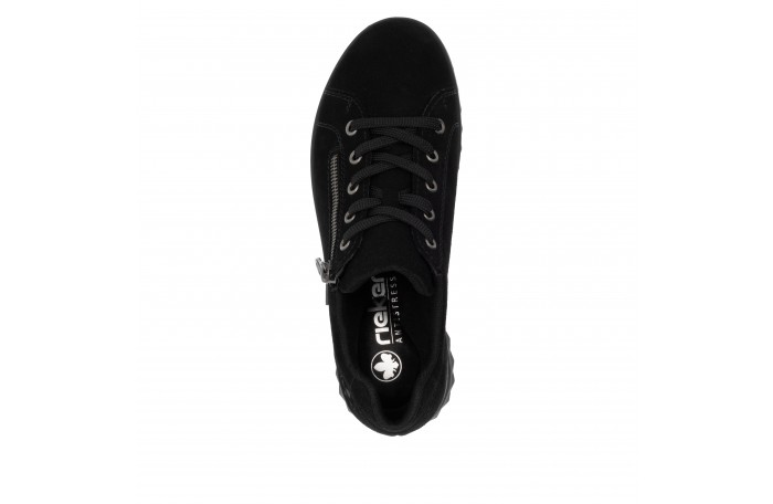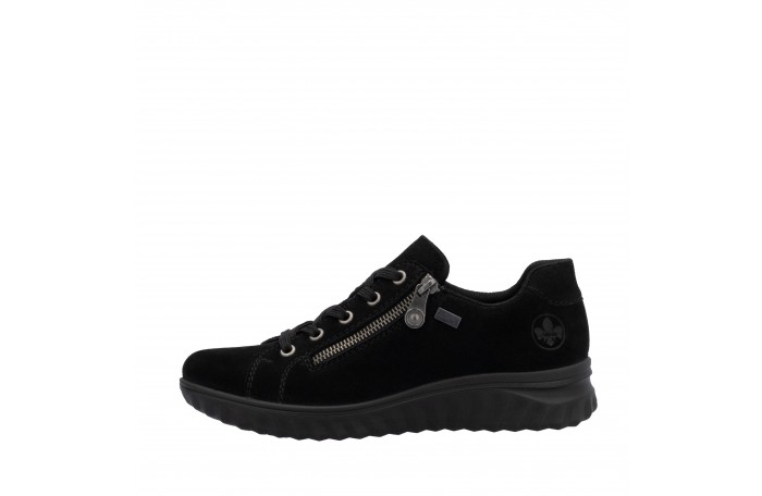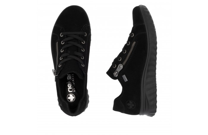 Riekerin musta tennari. Pinta mokkanahkaa. Tekstiilinen sisävuori. Irrotettava, pehmeä Antistress sisäpohjallinen, tekstiiliä. Sivulla vetoketju ja edessä nauhat. Jalkineessa on kosteutta hylkivä Rieker Tex-kalvo. Jalkineessa hieman tilavampi lesti.