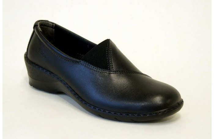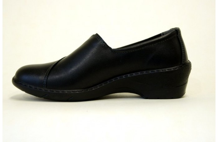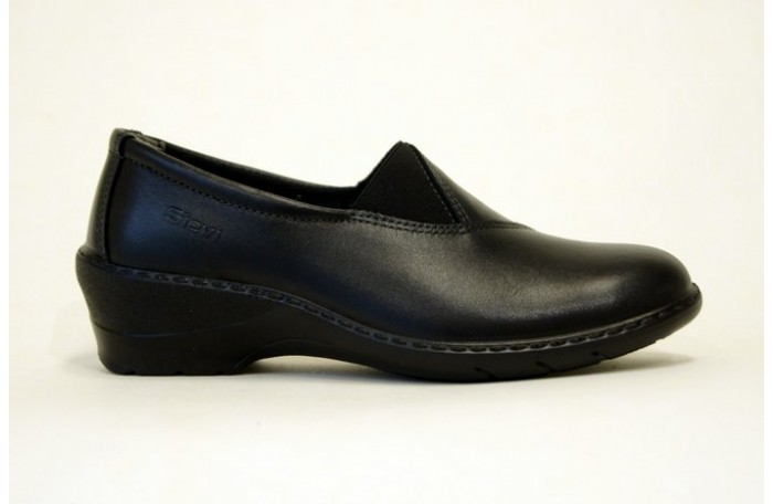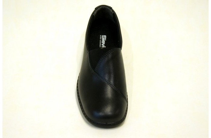 Sievin nahkainen kävelykenkä. Vuori tekstiiliä ja irrotettava tekstiili pohjallinen. Pujotettava malli. Edessä kuminauha venyke. Kannan korkeus n. 3 cm.