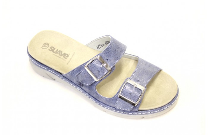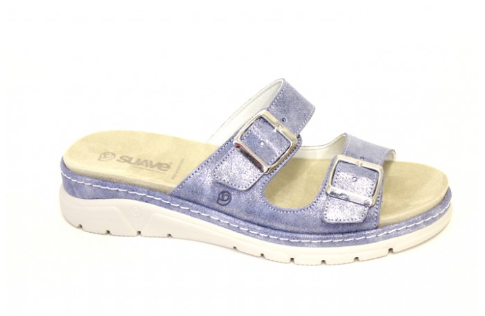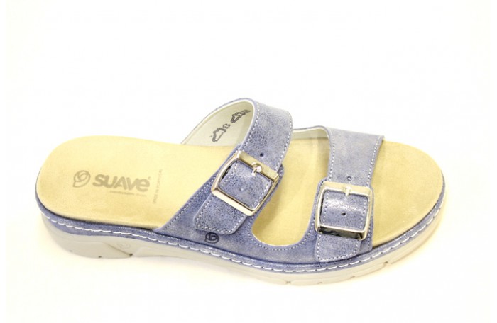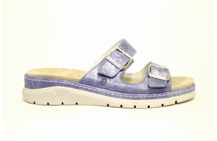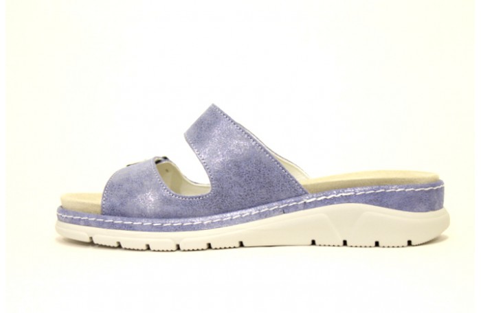 Portugalilainen, Suaven sininen, metallinhohtoinen pistokas sandaali. Edessä kaksi soljella säädettävää remmiä. Pinta nahkaa. Sisävuori ja pohjallinen hengittävää, nopeasti kuivuvaa ja antibakteeriseksi käsiteltyä Microfiber tekstiiliä. Paksu, irrotettava pohjallinen. Mahdollistaa vaihtamisen omaan pohjalliseen. Kannassa Air Function iskunvaimennus. Kannan korkeus n. 4 cm, etupohjan paksuus n. 2 cm. Jalkine on pesunkestävä.