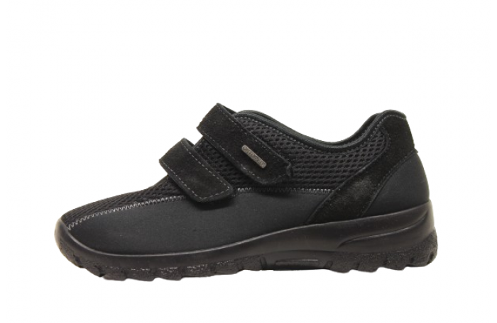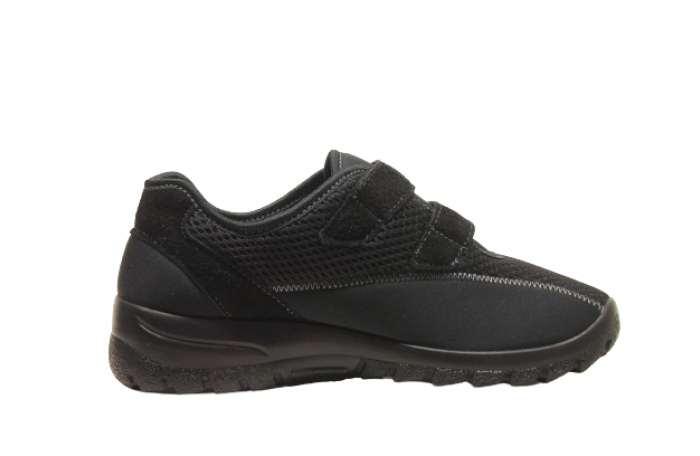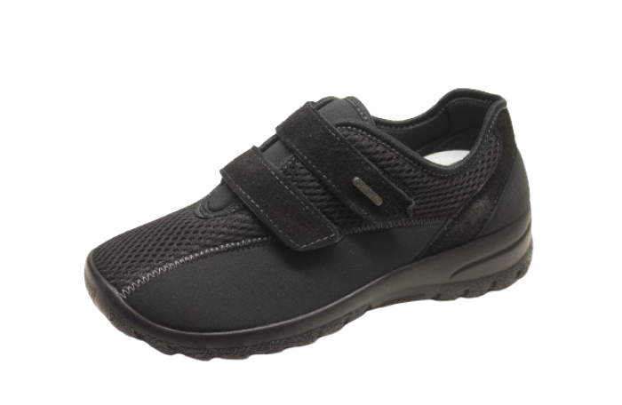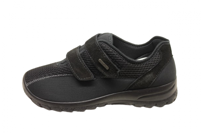 OrtoMed merkkinen musta kangas kenkä. Pinta joustavaa tekstiiliä ja irrotettava, pehmeä ja anatomisesti muotoiltu sisäpohjallinen. Kengän sisävuori pehmeää tekstiiliä. Jalkine on erittäin kevyt ja tilava lestinen. Päällä kaksi säädettävää tarraa. Kannan korkeus n. 4 cm. Sama jalkine myös punaisena ja sinisenä.