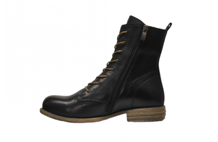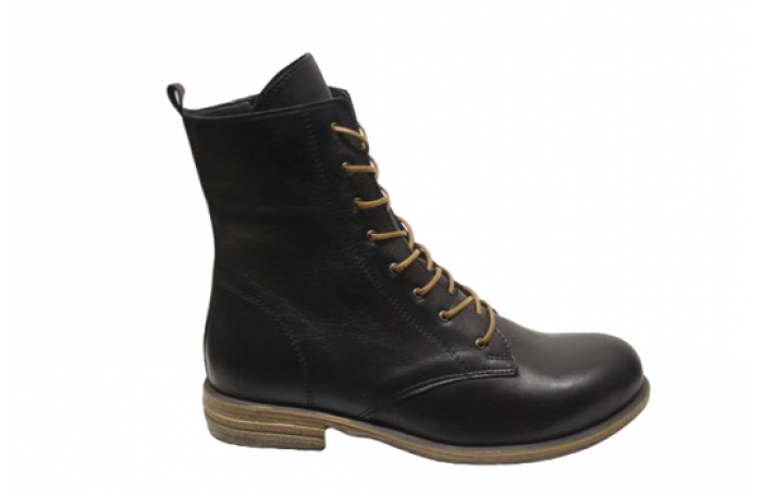 Magon musta, siro nilkkuri. Pinta nahkaa. Ohut lämminvuori ja nahkapohjallinen. Sisäsyrjällä vetoketju ja edessä nauhat. Kannan korkeus n. 3 cm. Sama jalkine löytyy myös ruskean - viininpunaisena.