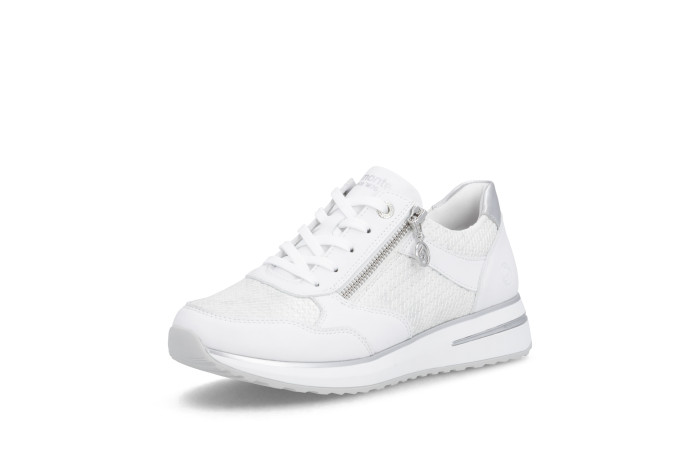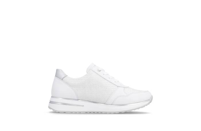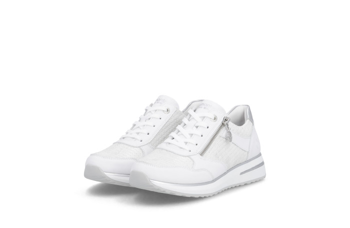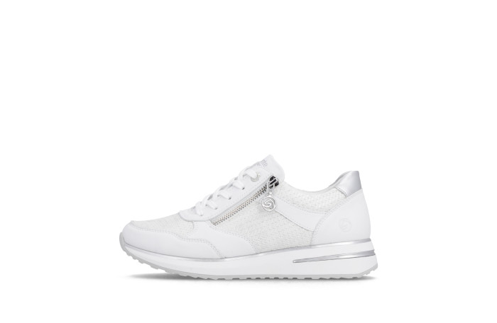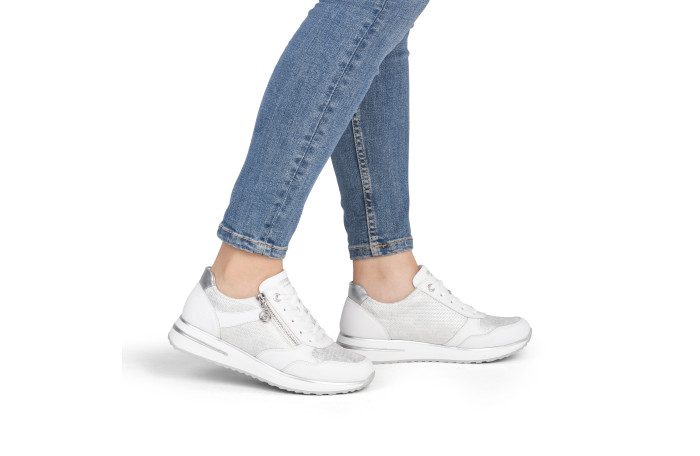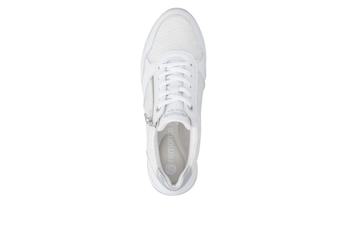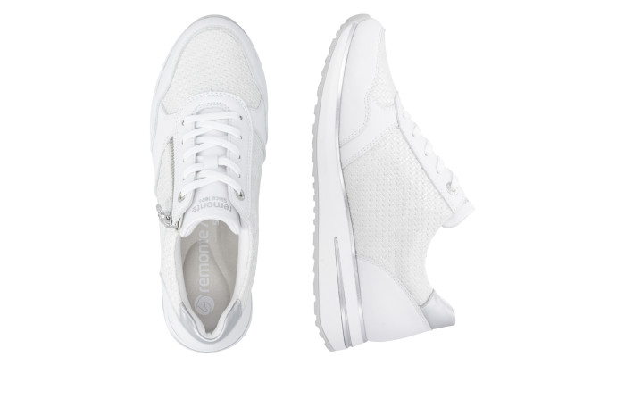 Remonten valkea tennari, jossa hopeisia yksityiskohtia. Pinta keinoainetta. Sisävuori tekstiiliä. Irrotettava Soft sisäpohjallinen tekstiiliä. Ulkosyrjällä vetoketju ja edessä nauhakiinnitys. Pieni kiilapohja. Kannan korkeus n. 4 cm.