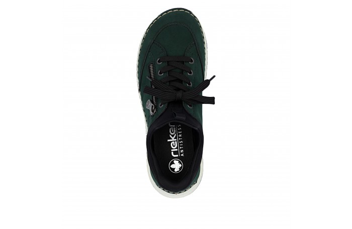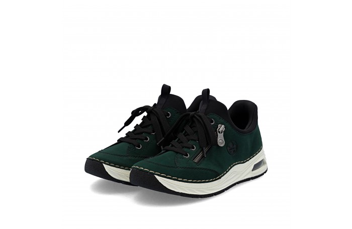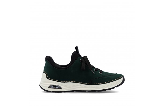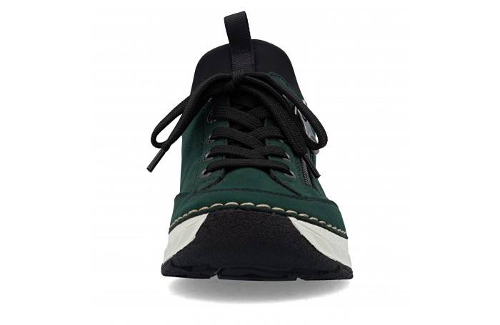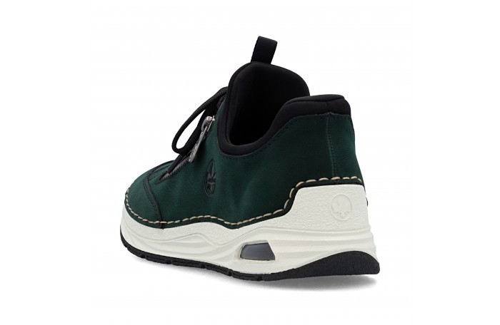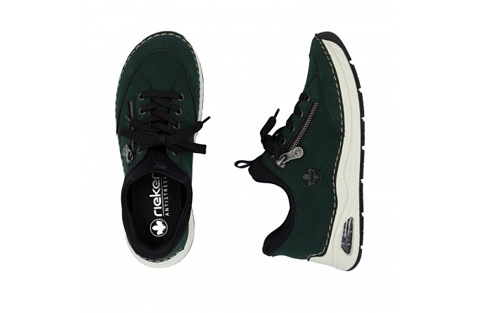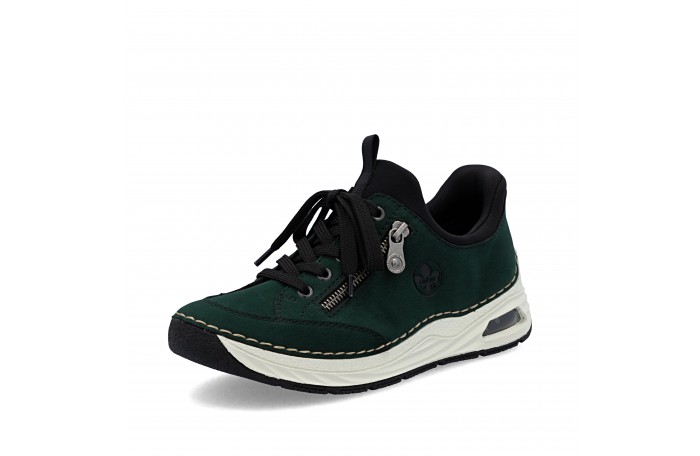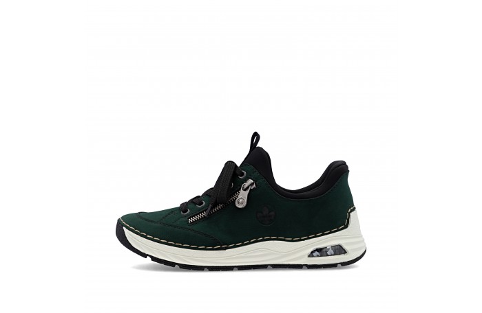 Riekerin tummanvihreä READY 2 G tennari. Pujotettava malli, jossa kantaosa vahvitettu siten, että kenkä menee helposti jalkaan ilman kenkälusikkaa. Pinta keinoainetta. Pehmeä tekstiilinen sisävuori ja nahkainen Antistress sisäpohjallinen. Edessä nauhoitus, jolla saadaan hieman säädettyä jalkinetta. Ulkosyrjän vetoketju somisteena. Kannan korkeus n. 3,5 cm.