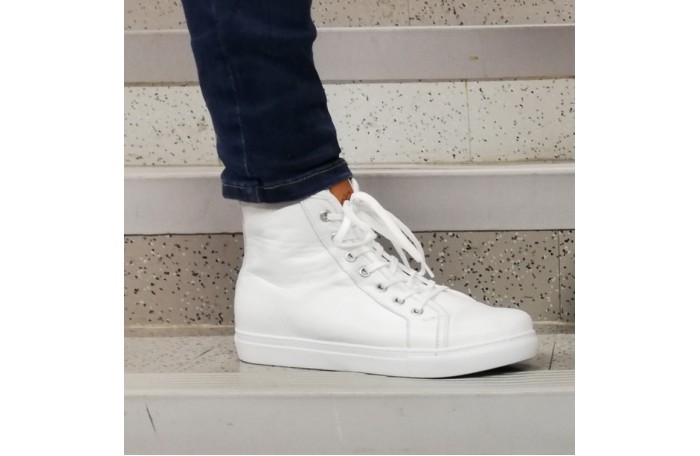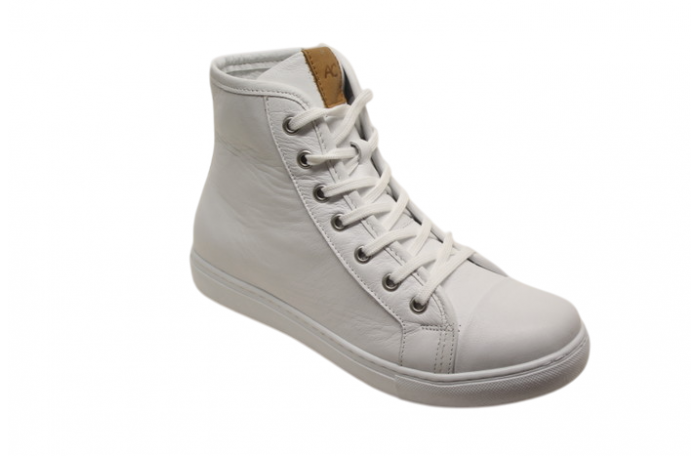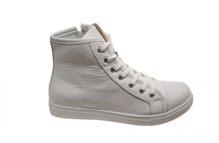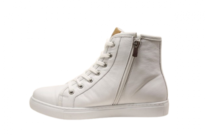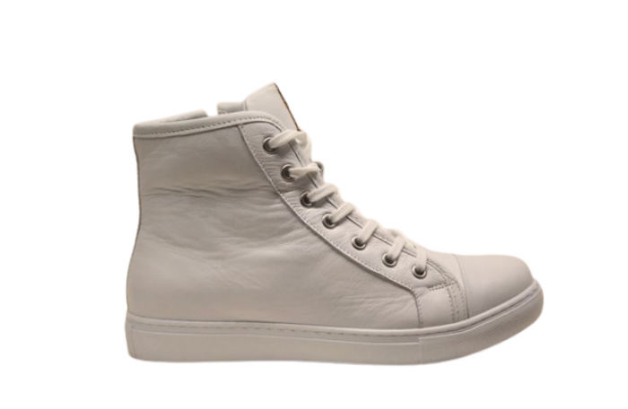 Andrea Contin valkea tennarit. Pinta-, sisävuori ja irrotettava sisäpohjallinen nahkaa. Sisäsyrjällä vetoketju ja edessä nauhat. Kenkä on reilu ja tilava lestinen, joten menee rintavammallekin jalalle ja sopii myös omille pohjallisille. Kannan korkeus n. 2 cm. Super pehmeä ja tilava tennari.