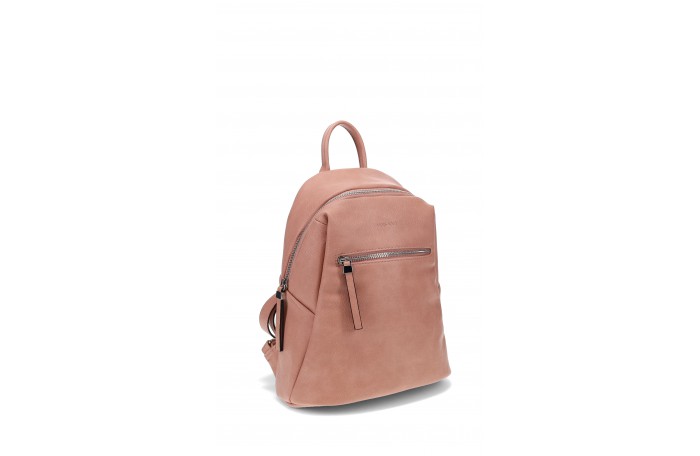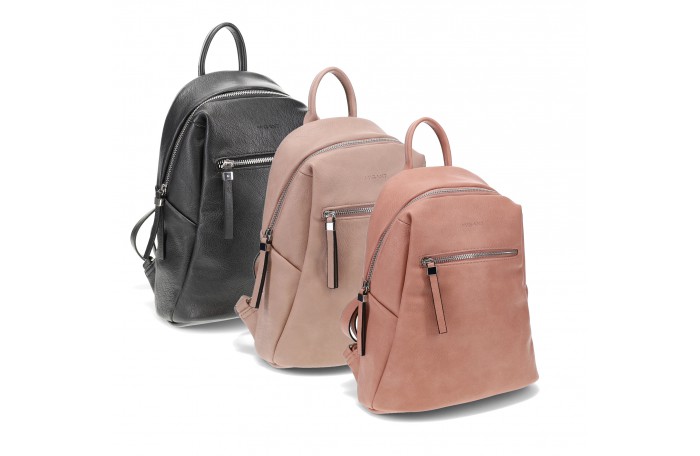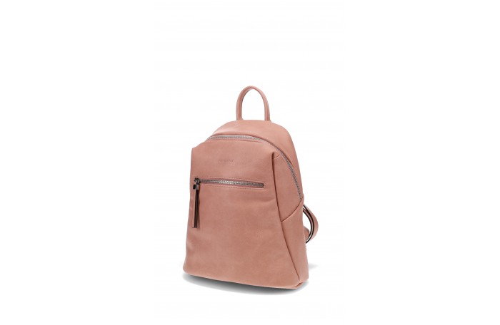 Migantin roosa reppu. Pinta keinoainetta. Edessä vetoketjullinen tasku. Takana pystysuuntaan avautuva vetoketju tasku. Sisältä löytyy avotasku ja vetoketjullinen tasku. Reppua kolmessa eri värissä; musta, nude ja roosa. Repun mitat n. 25 x 15 x 30 cm