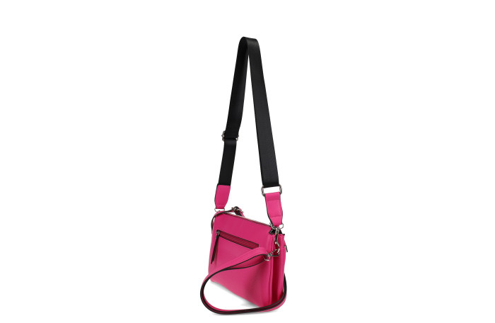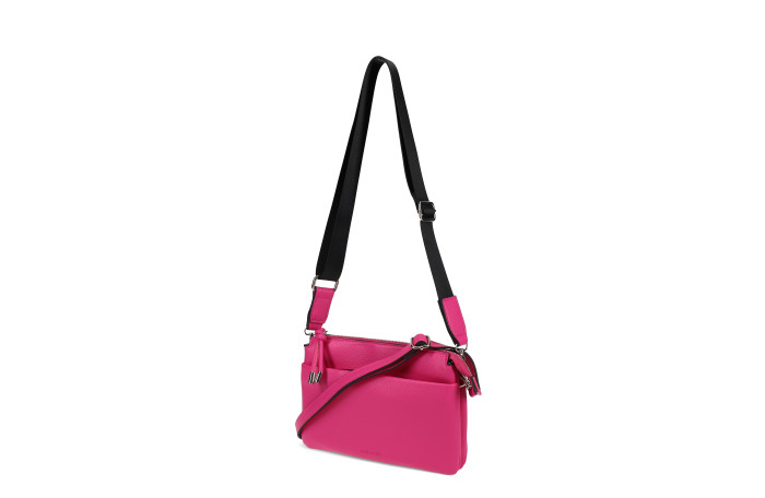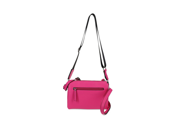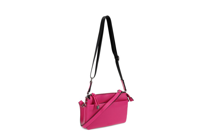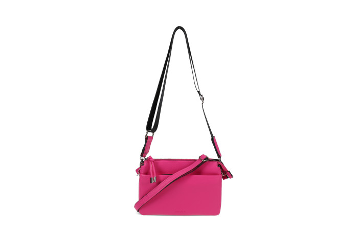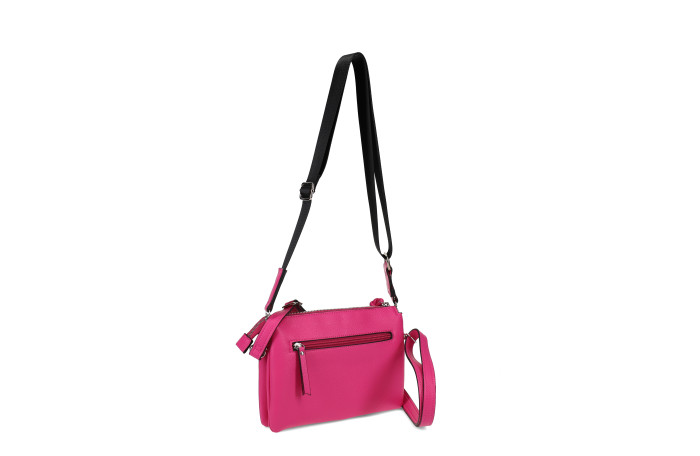 Migantin fuxia olkalaukku. Pinta keinoainetta. Takana ja edessä vetoketjullinen tasku. Laukun sisällä jakotila. Lisäksi sisältä löytyy vetoketjullinen sisätasku ja ns. avotasku. Laukussa säädettävä keinonahkainen olkahihna, sekä mukana myös vaihdettava, paksumpi, tekstiilinen olkahihna. Laukun mitat n. 24 x 04  x 17 cm. Mallista saatavilla neljä  eri väri vaihtoehtoa; musta, fuksia, luonnonvaalea ja roosa.