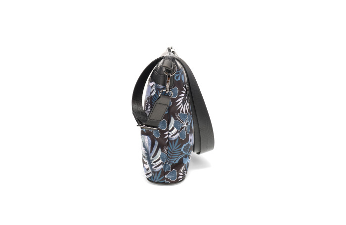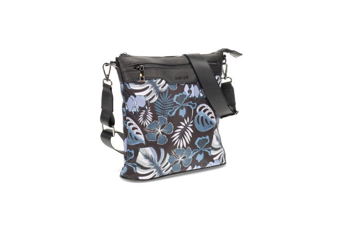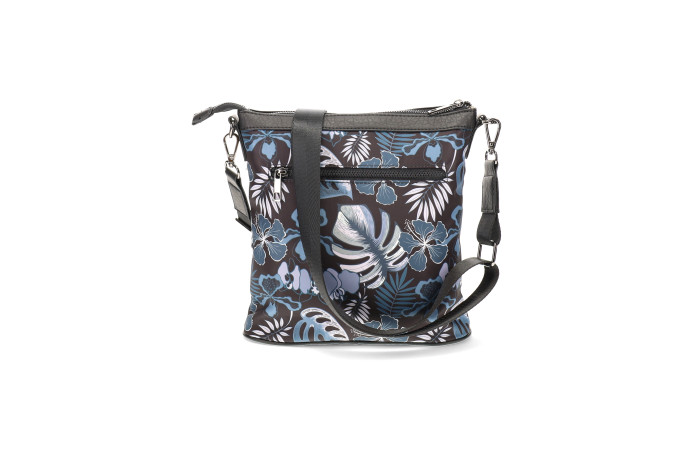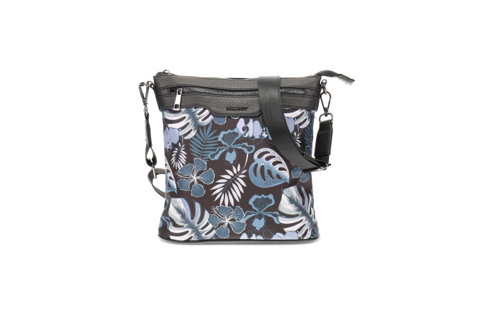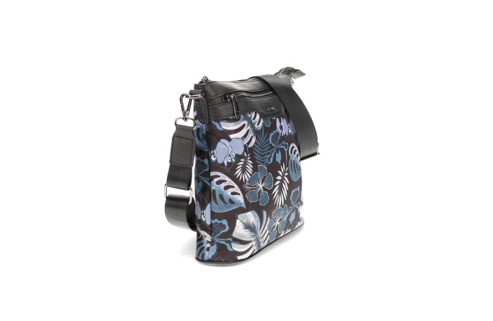 Migantin musta - sinikuvioinen olkalaukku. Pinta likaa ja kosteutta hylkivää tekstiiliä. Edessä ja takana vetoketjullinen tasku. Laukun sisällä vetoketjullinen tasku ja avotasku. Laukussa mukana kaksi säädettävää olkahihnaa. Leveä tekstiilinen hihna tai ohuempi keinonahka hihna. Laukun mitat n. 24 x 08 x 25 cm.