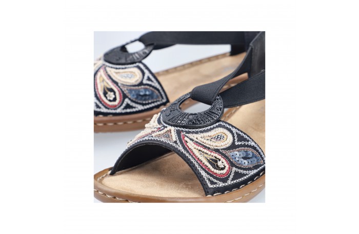 Riekerin musta sandaali. Edessä helmi somisteita. Pinta- ja sisävuori keinoainetta ja pehmeä Antistress sisäpohja tekstiiliä. Pujotettava malli, jossa joustavat kuminauharemmit helpottavat pukemista. Kannan korkeus n. 4 cm.