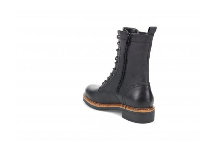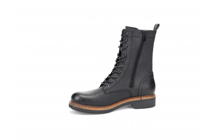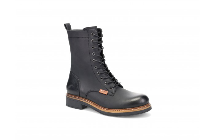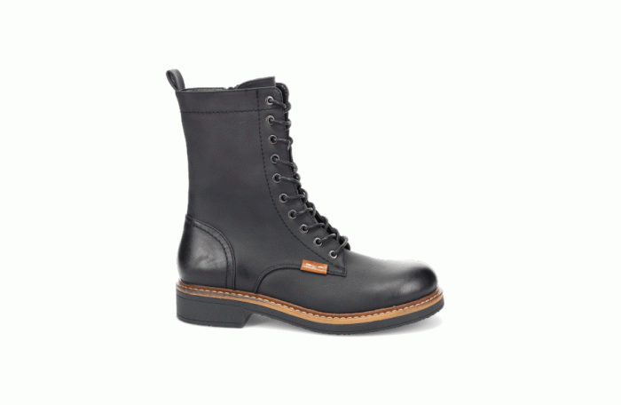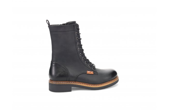 Migantin musta, hieman pidempi vartinen talvinilkkuri. Pinta keinoainetta. Lämmin turkisvuori ja huopapohjallinen. Sisäsyrjällä vetoketju ja edessä nauhat. Kannan korkeus n. 3 cm. Pitävä kumipohja. Melko tilava lestinen jalkine. Sama jalkine konjakin värissä.