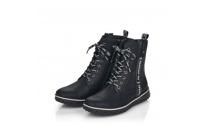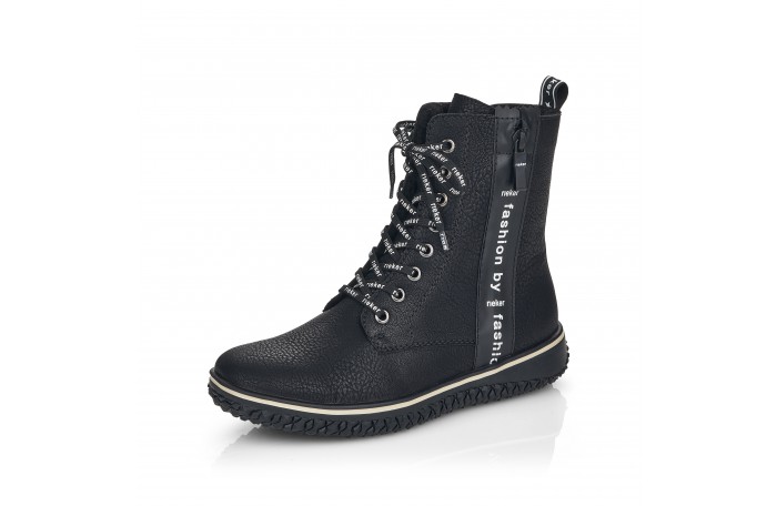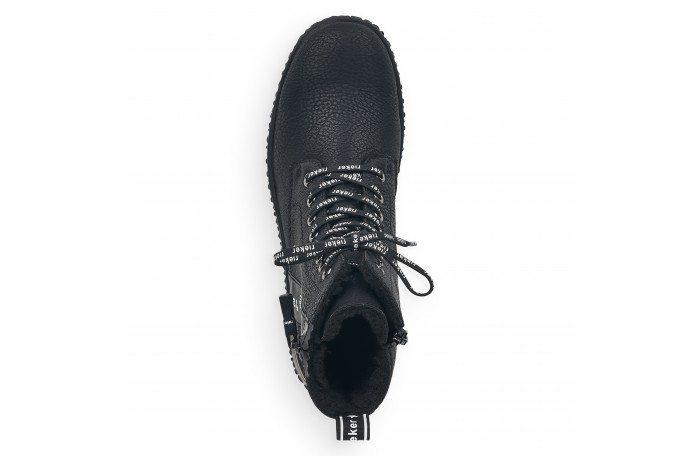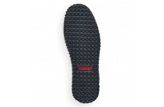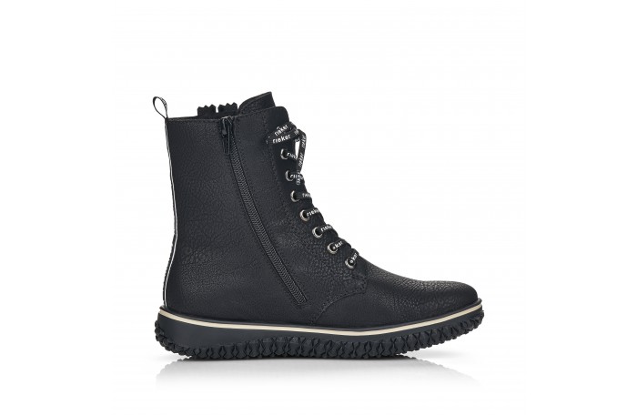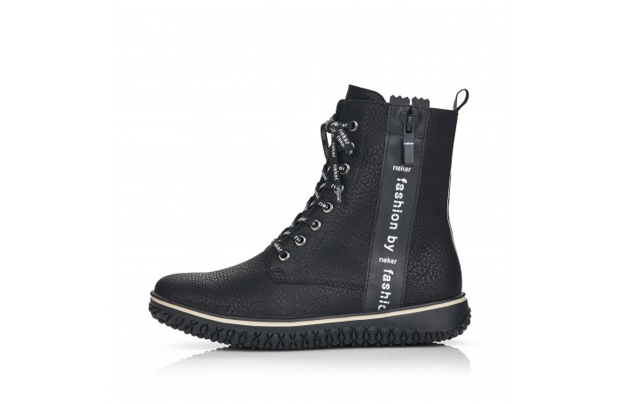 Riekerin mustat talvinilkkurit. Pinta vettä hylkivää keinoainetta. Paksu turkisvuori ja huopapohjallinen. Sisäsyrjällä vetoketju ja edessä nauhoitus. Pitävän tuntuinen ulkopohja. Kannan korkeus n. 3 cm.