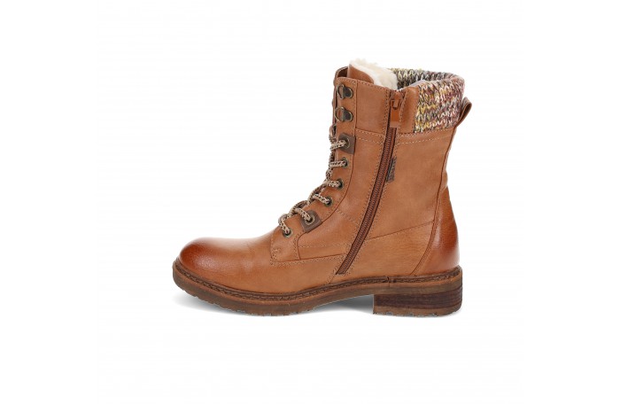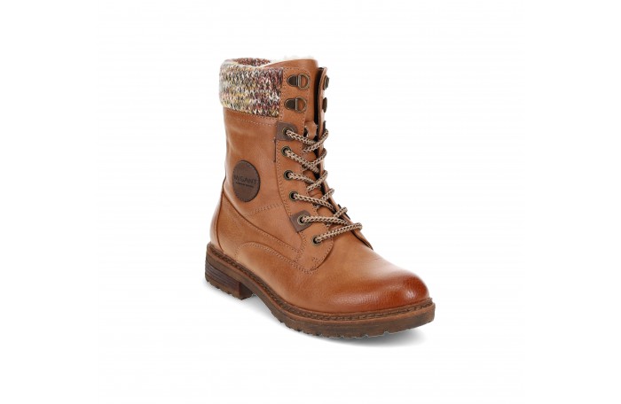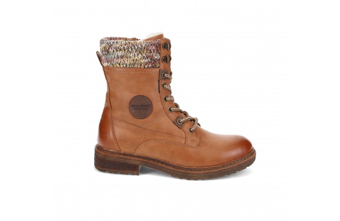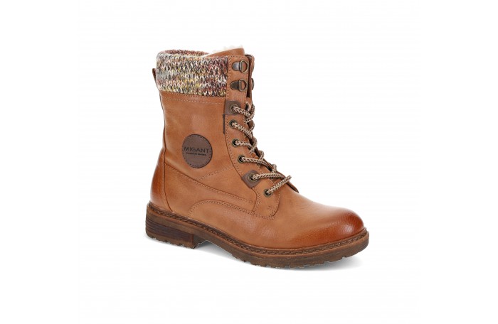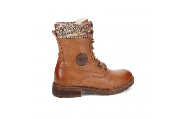 Migantin ruskea, hieman pidempi vartinen talvinilkkuri. Pinta keinoainetta. Varrensuulla kirjava neulos. Lämmin turkisvuori ja huopapohjallinen. Sisäsyrjällä vetoketju ja edessä nauhat. Kannan korkeus n. 3 cm. Pitävä ulkopohja. Melko tilava lestinen jalkine. Sama jalkine myös mustana.