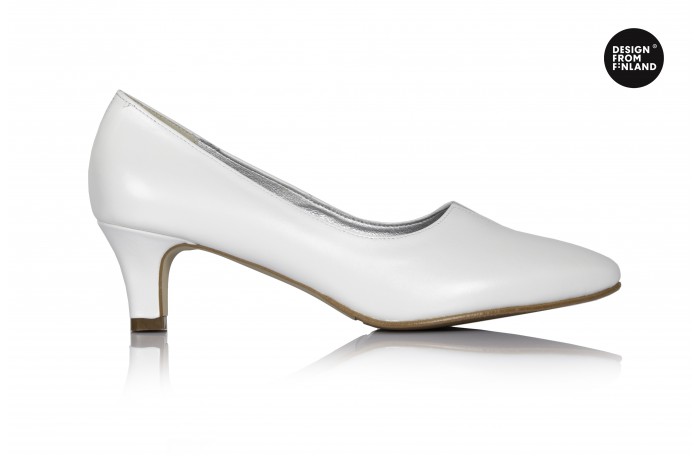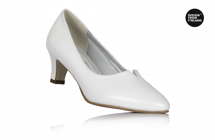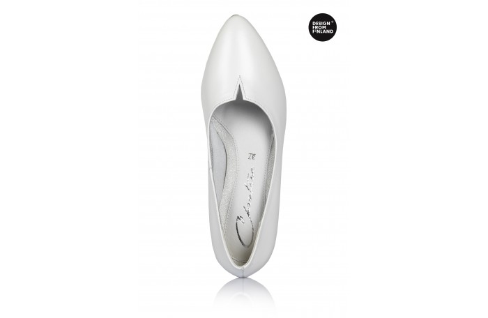 Chantanan Design from Finland avokas. Väri helmiäisen valkea. Pinta nahkaa. Sisävuori tekstiiliä ja sisäpohjallinen nahkaa. Avokkaan päällä pieni v-leikkaus, joka lisää avokkaaseen hieman avoimmuutta. Kannan korkeus n. 4,5 cm. Avokkaassa tanssipohja. Hyvä kotimainen lesti. Sama malli löytyy myös mustana ja nude pinkkinä.