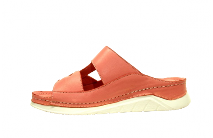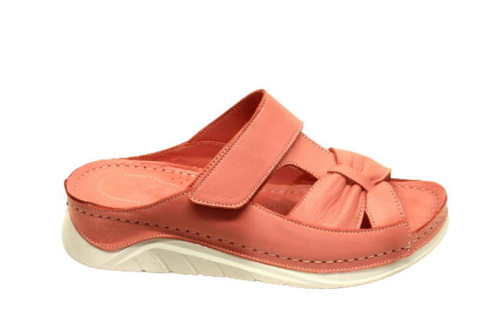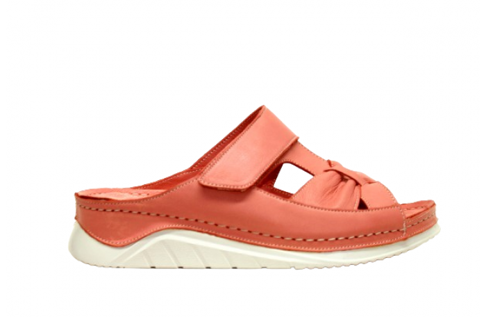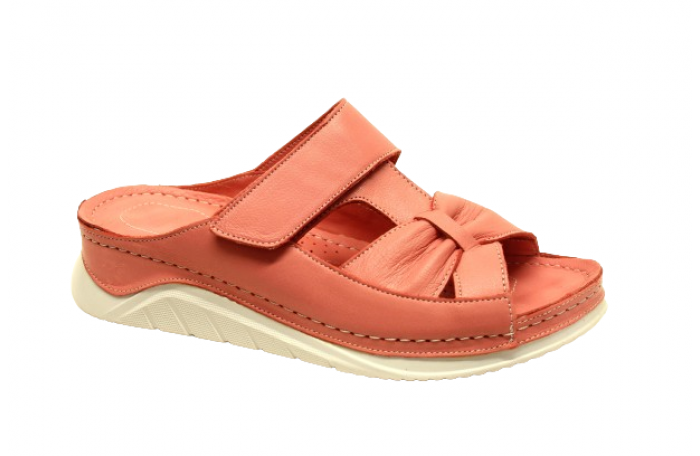 Magon korallin värinen pistokas. Pinta-, sisävuori ja sisäpohjallinen nahkaa. Jalkineessa on erittäin pehmeä sisäpohja, jossa on hyvin pehmeitä jalkapohjaa stimuloivia "nystyröitä". Sandaaleissa melko tilava lesti. Yläosassa tarralla säädettävä remmi. Kannan korkeus n. 4,5 cm.