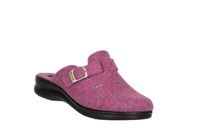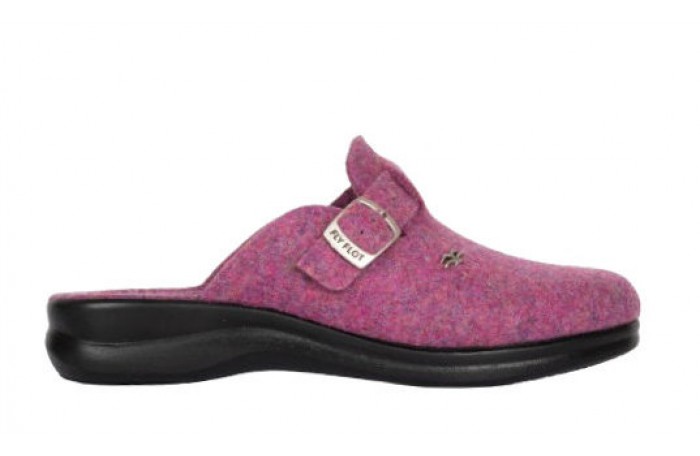 Fly Flotin kotikenkä. Tumma fuxia väritys. Pinta huopamaisen oloista, joka on tehty kierrätysmateriaalista. Edessä pieni metallinen somiste. Kengässä on iskunvaimennus, anatomisesti muotoiltu sisäpohja ja pitävä ulkopohja. Pistokasmalli, jota voi säätää hieman päällä olevalla remmillä.