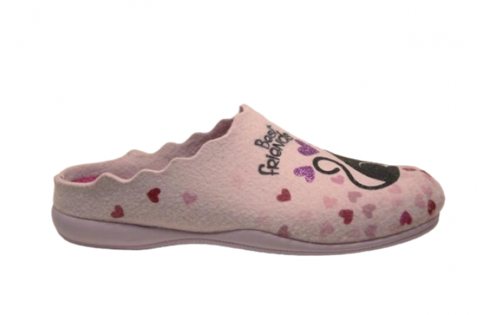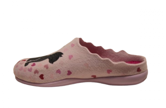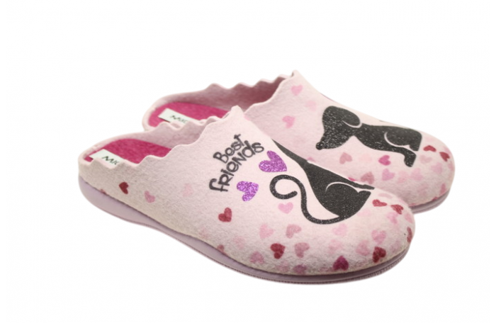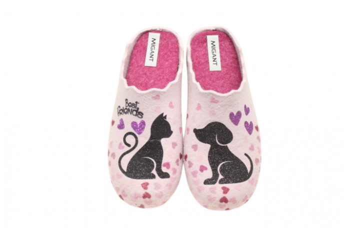 Migantin vaalean pinkit huopapistokkaat, joissa kissan ja koiran kuva. Materiaali villaa 70 % ja polyesteri 30 %. Pistokkaasta on irrotettava sisäpohjallinen, joka mahdollistaa oman pohjallisen käytön.