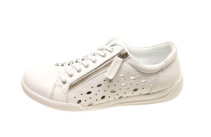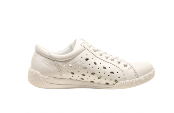 Andrea Contin valkea tennari. Pinta-, sisävuori ja irrotettava sisäpohjallinen nahkaa. Ulkosyrjällä vetoketju ja edessä nauha kiinnitys. Jalkineen sivuilla olevat reiät antavat kenkään ilmavuutta. Tennarissa on eriitäin pehmeä nahka ja melko tilava lesti. Irrotettavan sisäpohjallisen vuoksi jalkine menee myös omille pohjallisille. Kannan korkeus n. 2,5 cm. Sama malli Magenta värinä.