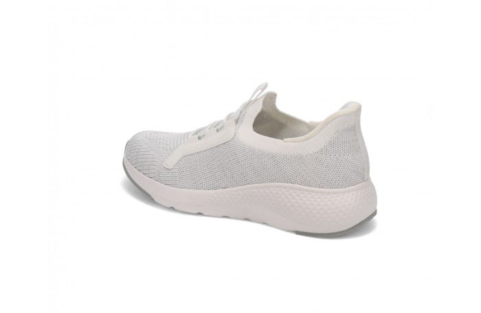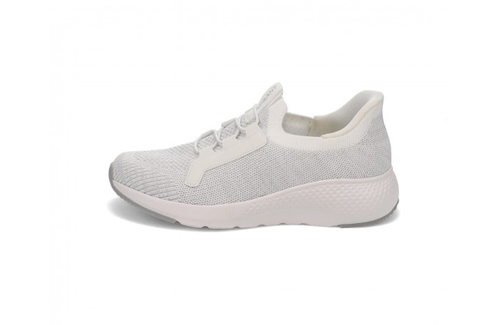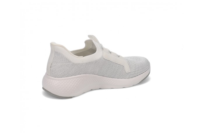 Migantin valkea Easy Step-kangastennari. Pinta ja sisävuori tekstiiliä. Paksu, pehmeä, joustava ja irrotettava sisäpohjallinen, tekstiiliä. Pujotettava malli, jossa kengän kantaosa vahvistettu, niin että kengät menevät pujottamalla jalkaan, ilman kenkälusikkaa. Tilava lesti. Kannan korkeus n. 3 cm.