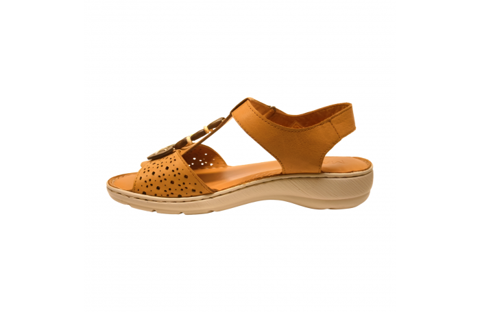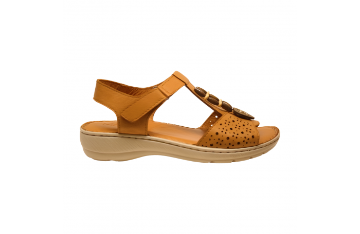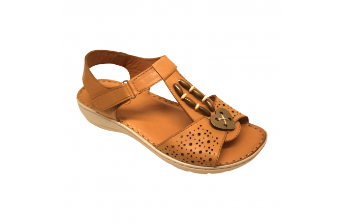 Magon ruskea sandaali. Pinta-, ja sisävuori nahkaa. Erittäin pehmeä ja joustava nahkainen sisäpohjallinen. Yläosassa tarra säätö. Sandaalin päällä puinen sydän ja puiset helmisomisteet. Kannan korkeus n. 3 cm. Melko tilava lesti.