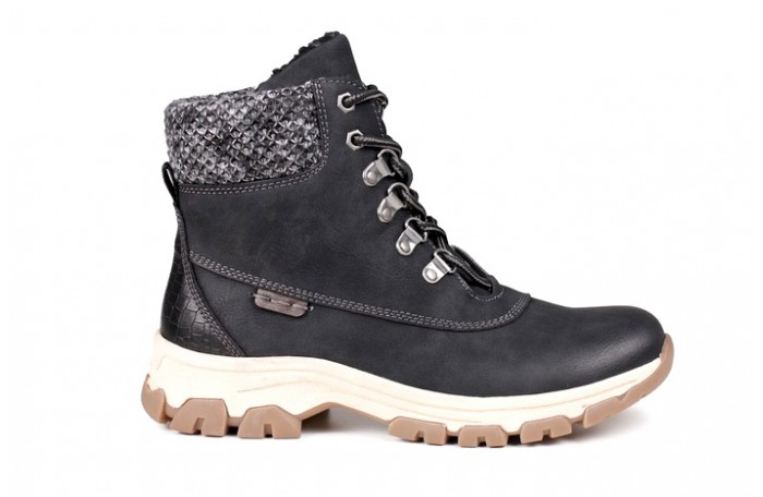 Migantin musta talvinilkkuri. Varrensuussa vaaleampi neulosreunus. Pinta keinoainetta. Lämmin turkisvuori ja huopapohjallinen. Sisäsyrjällä vetoketju ja edessä nauhat. Kengässä pitävä ulkopohja. Kannan korkeus n. 4 cm, etupohja n. 2 cm. Malli on kapea lestinen.