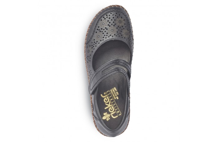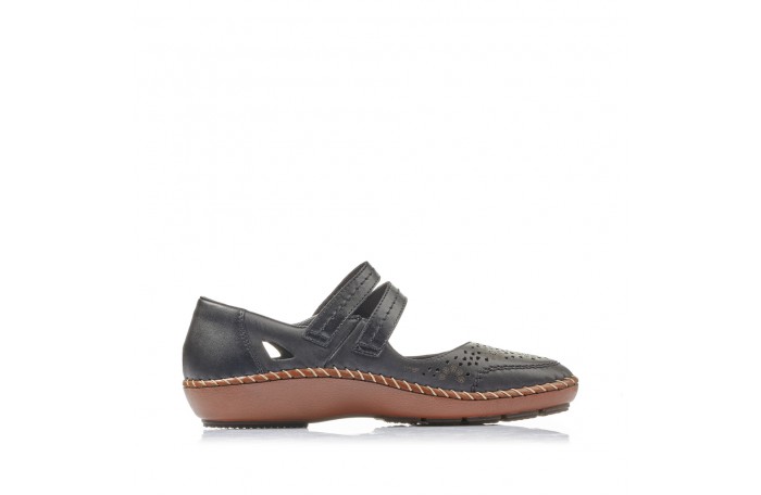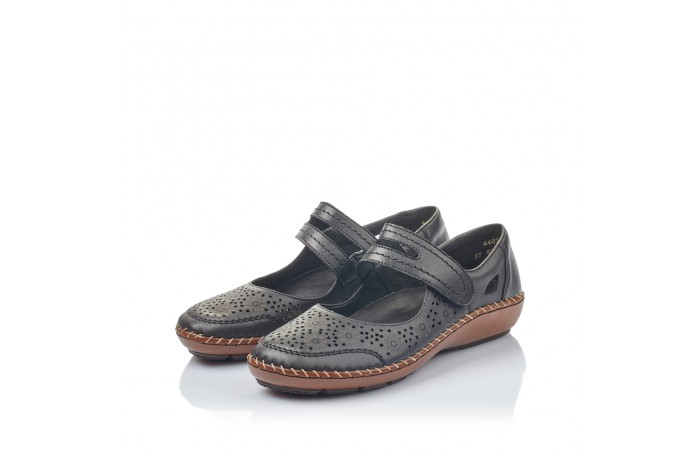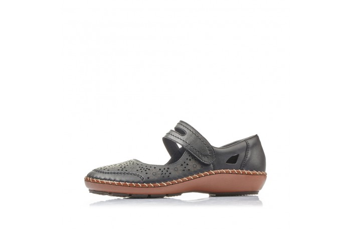 Riekerin musta balleriina. Pinta nahkaa. Miellyttävän pehmeä nahkapohjallinen. Kengän ulkonäköä piristävät reiät ja ruskean sävyinen pohjareuna. Päällä remmi tarrakiinnityksellä. Hieman reilumpi lestinen. Kannankorkeus n. 2 cm
