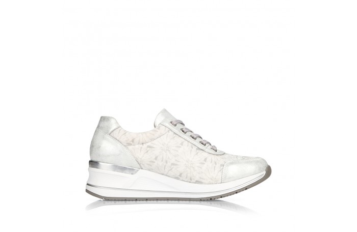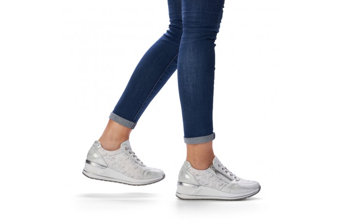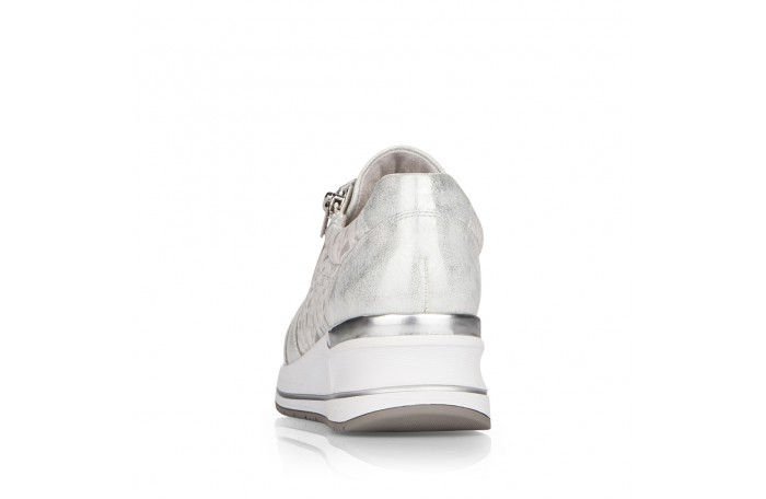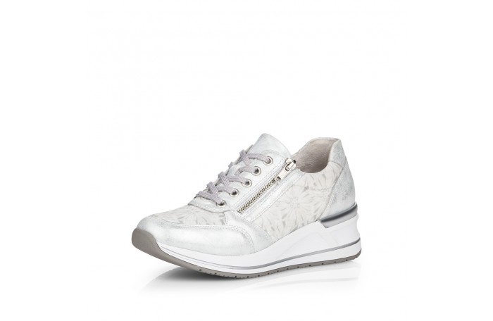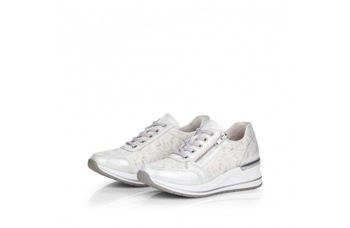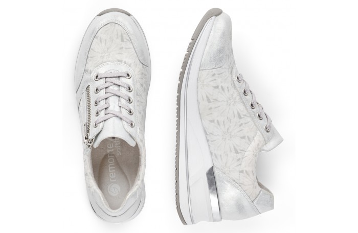 Remonten valkea - hopeasävyinen lenkkari. Pinta elastista eli joustavaa tekstiiliä / keinoainetta. Tosi pehmeää sisävuori. Irrotettava, pehmeä Soft foam sisäpohjallinen. Nauhakiinnitys ja ulkosyrjällä oleva vetoketju helpottavat pukemista. Tilava lesti. Paksumpi ulkopohja. Kannan korkeus n. 4 cm. Jalkineessa tilavampi H-lesti. Todella hyvä, pehmeä ja tilava jalkine.