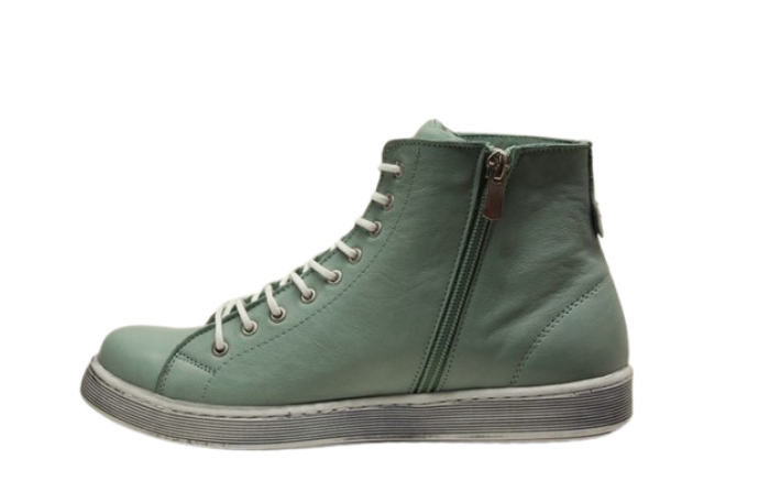 Andrea Contin vaalean vihreä tennarit. Pinta-, sisävuori ja irrotettava sisäpohjallinen nahkaa. Sisäsyrjällä vetoketju ja edessä nauhat. Kenkä on reilu ja tilava lestinen, joten menee rintavammallekin jalalle ja sopii myös omille pohjallisille. Kannan korkeus n. 2 cm. Todellinen väri vaaleampi, kuin mitä kuva antaa ymmärtää.