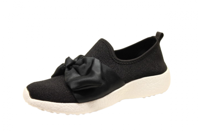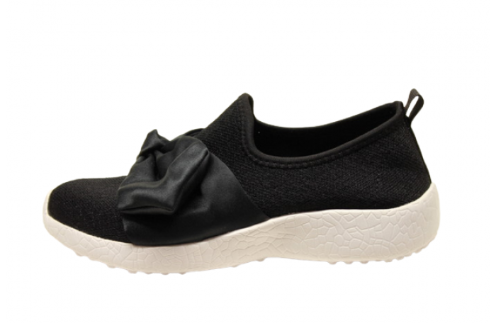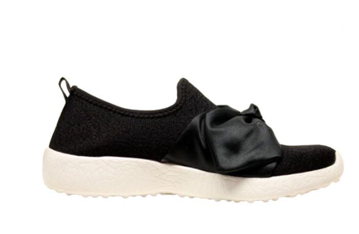 Migantin musta kangaskenkä. Päällä soma satiini rusetti. Pinta tekstiiliä. Irrotettava, pe..
