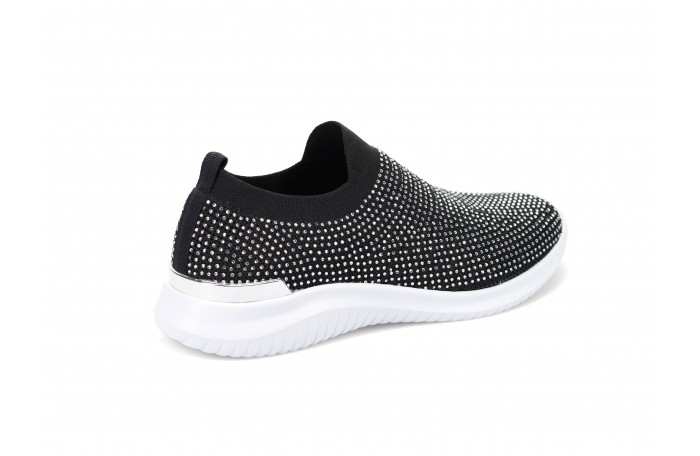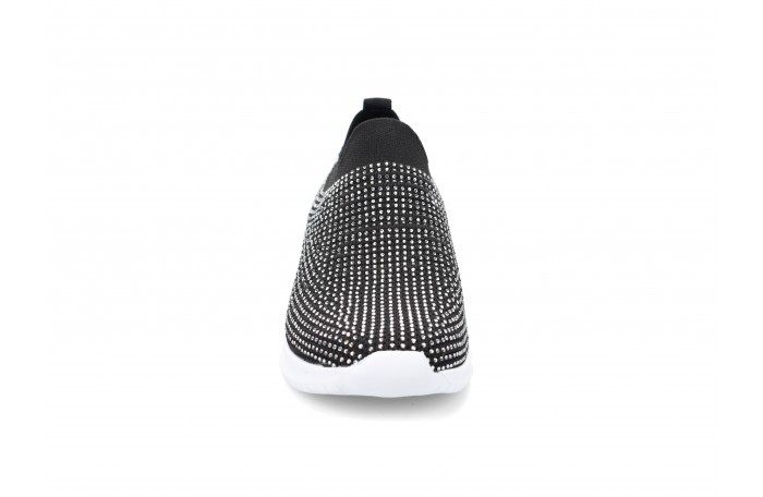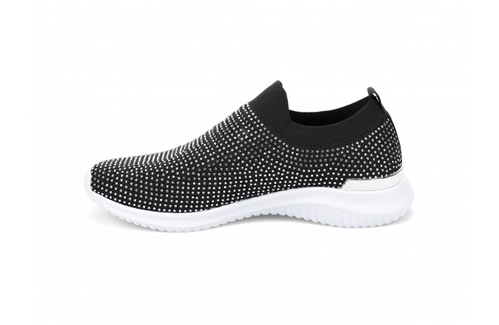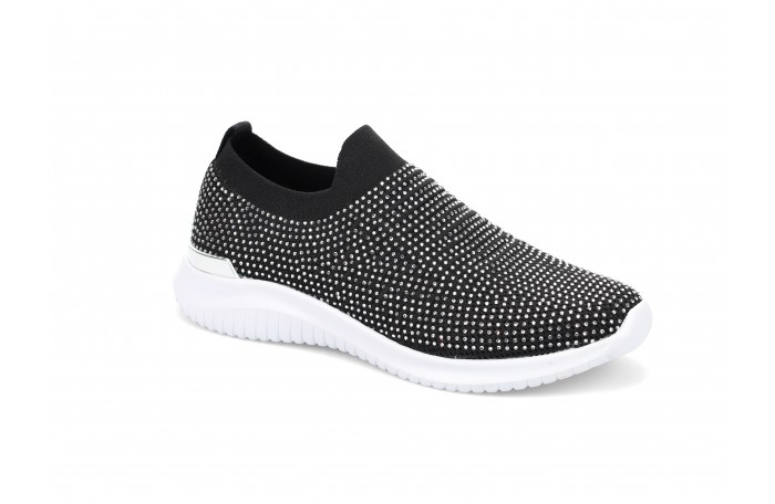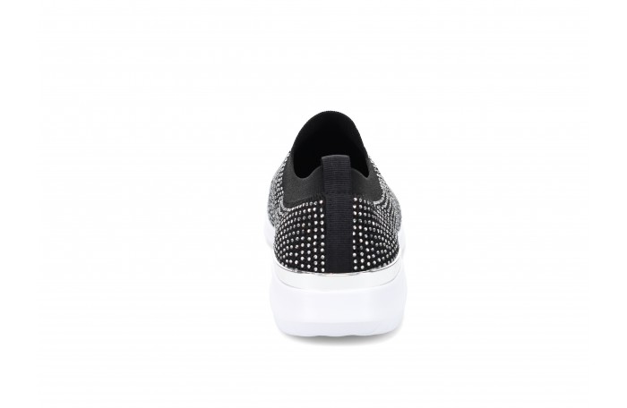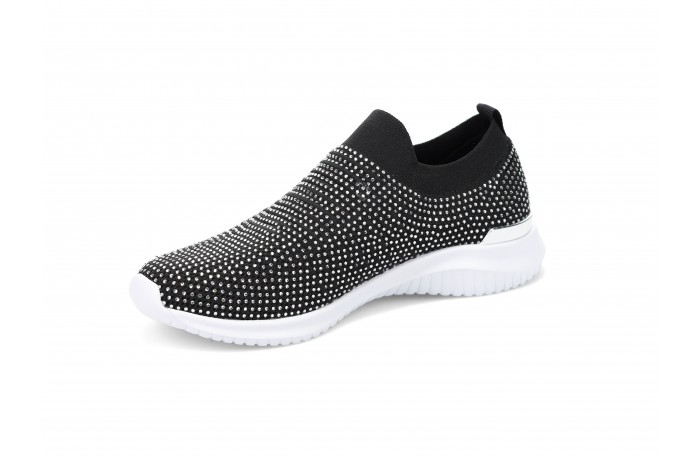 Migantin mustat kangaskengät. Kengän pinnassa hopeanvärisiä "kristalleja" ja kannassa hopea somiste. Kengän pinta hieman joustavaa tekstiiliä. Pehmeä ja irrotettava sisäpohjallinen. Kannan korkeus n. 3,5 cm. Pujotettava malli, jossa varrensuussa resorimainen tekstiili. Sama jalkine myös valkoisena ja beigenä.