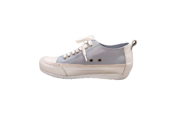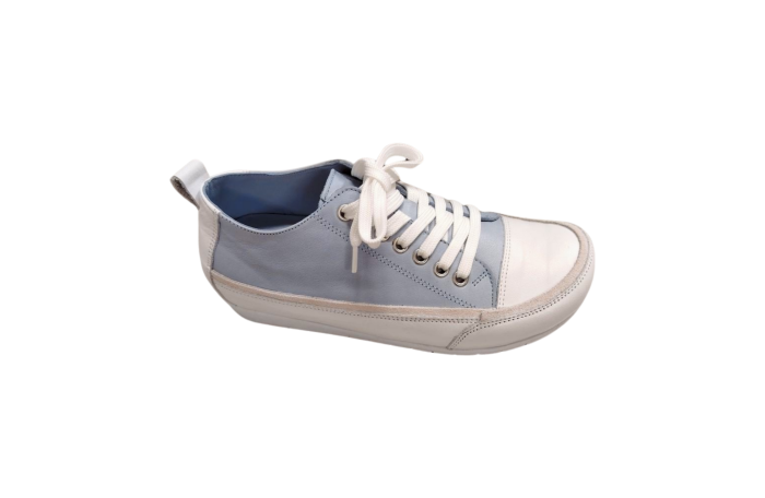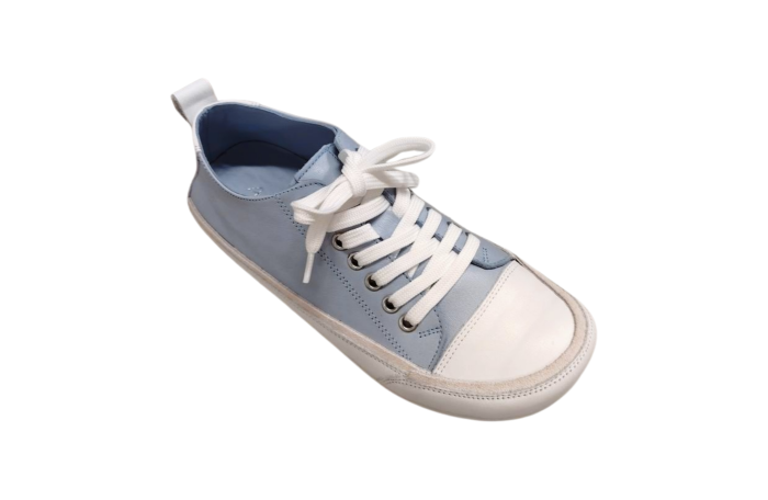 Andrea Contin vaaleansininen, retrotyylinen tennari. Pinta- ja sisävuori nahkaa. Erittäin pehmeä, irrotettava sisäpohjallinen nahkaa. Irrotettavan sisäpohjallisen vuoksi jalkine menee myös omille pohjallisille. Edessä nauhakiinnitys. Kengässä on tilava lesti.