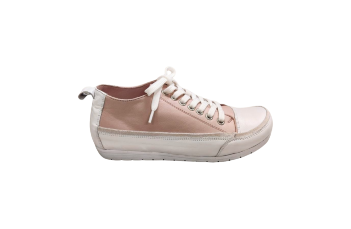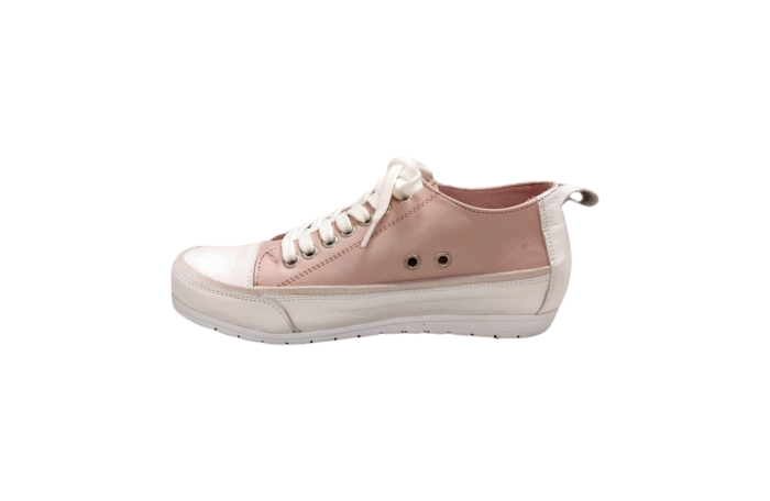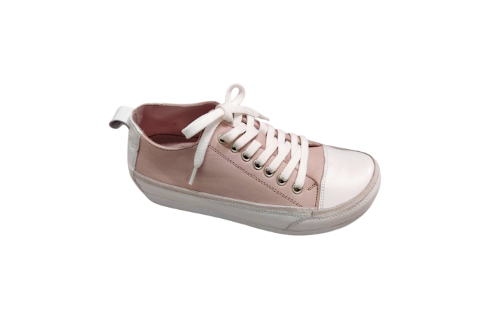 Andrea Contin vaalean roosa, retrotyylinen tennari. Pinta- ja sisävuori nahkaa. Erittäin pehmeä, irrotettava sisäpohjallinen nahkaa. Irrotettavan sisäpohjallisen vuoksi jalkine menee myös omille pohjallisille. Edessä nauhakiinnitys. Kengässä on tilava lesti.