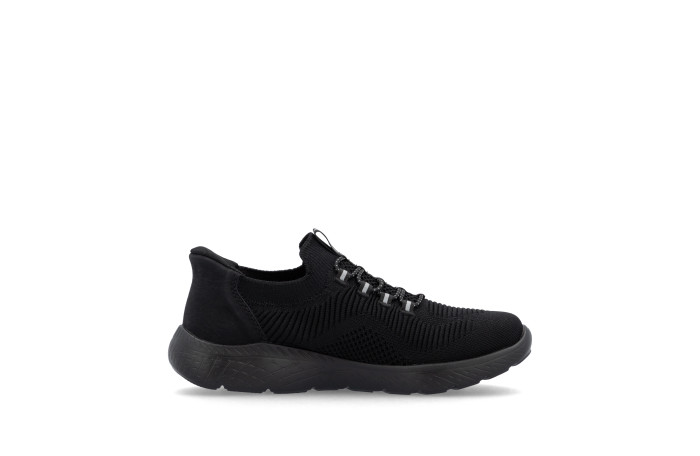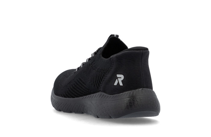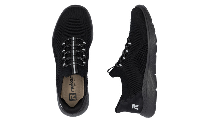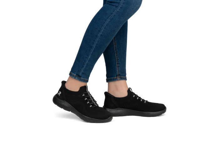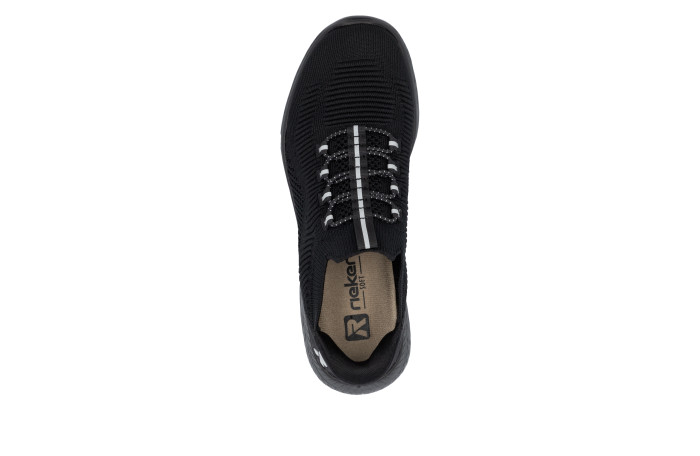 Riekerin musta READY 2 GO tennari. Kantaosa muotoiltu ja vahvistettu siten, että kenkä menee jalkaan, ilman kenkälusikkaa. Pinta tekstiiliä. Jalkineessa on miellyttävä, irrotettava Soft sisäpohjallinen. Edessä oleva nauhoitus somisteena. Kannan korkeus n. 3 cm.