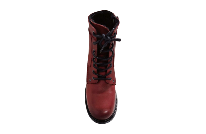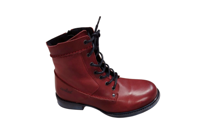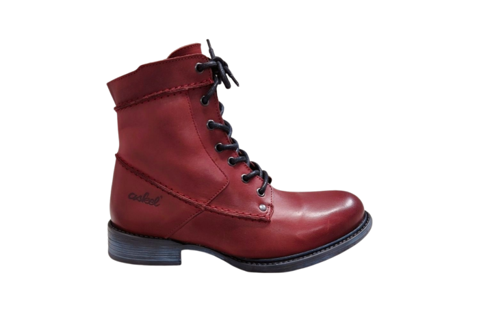 Askeleen viinipunainen Saaga nilkkuri. Askeleen sirompi, normilestinen nilkkuri. Pinta nahkaa. Ohut vuori ja lämpöpohjallinen. Sisäsyrjällä vetoketju ja edessä nauhoitus. Pitävä ulkopohja. Kannan korkeus n. 3 cm.